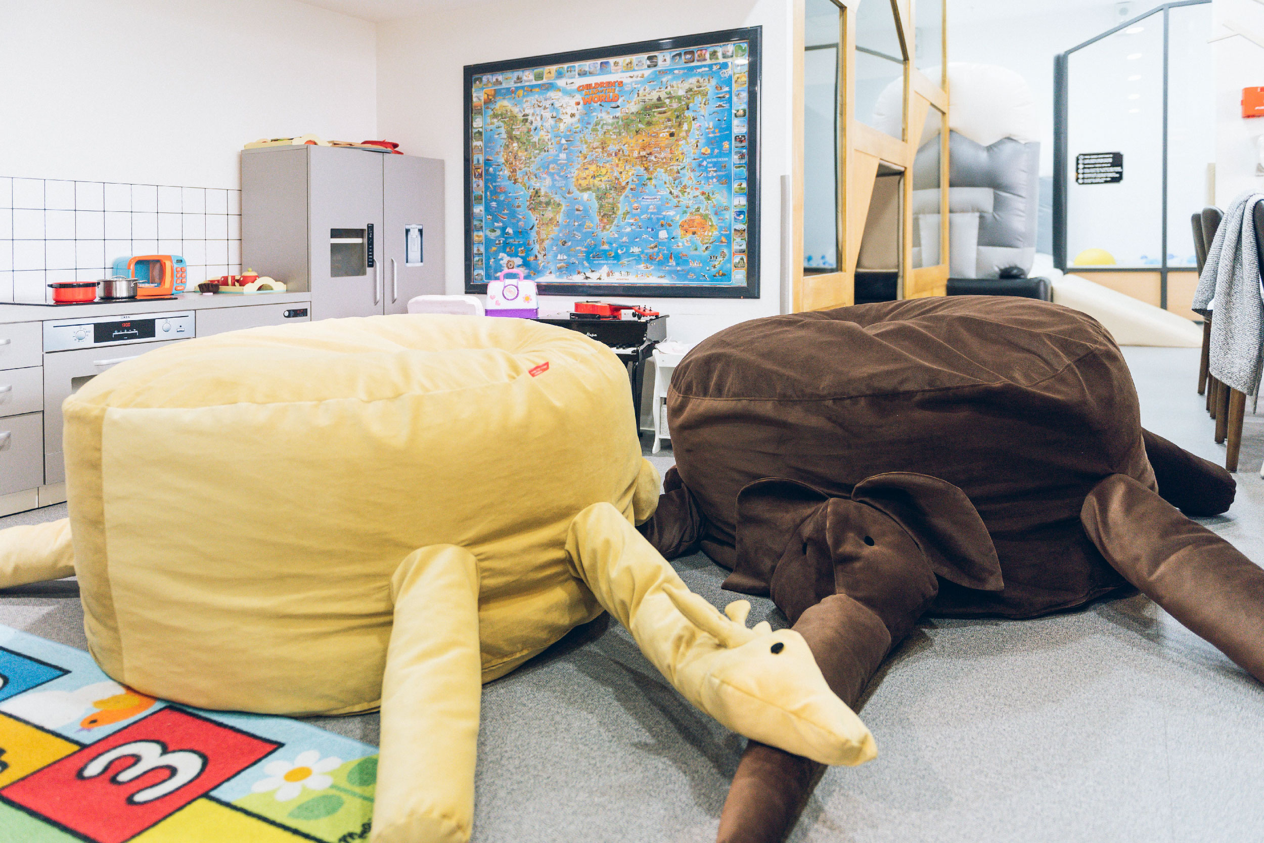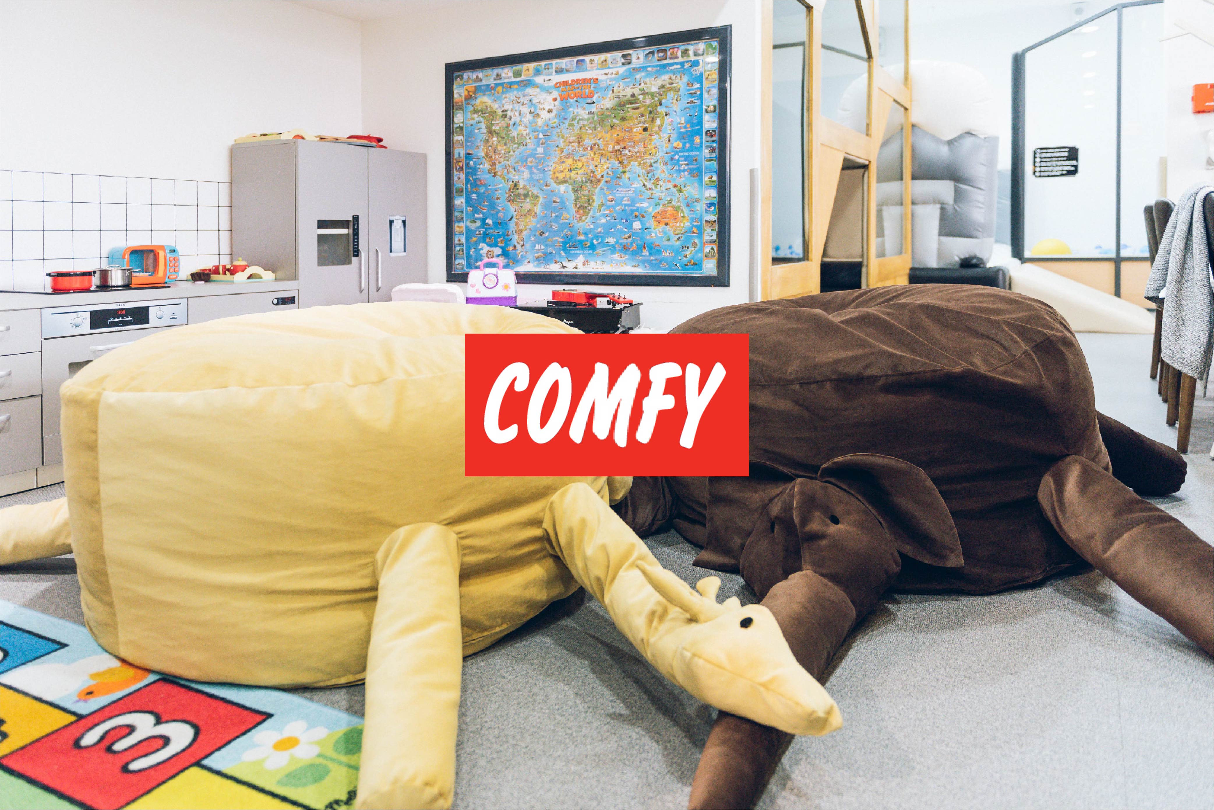 Хүүхдийн орчин бүрдүүлэхэд санал болгох бүтээгдэхүүнүүд манайх гаргадаг. Энд амьтны хэлбэртэй beanbag (заан, анааш гэх мэт), навчин хэлбэртэй газрын дэвсгэр, яст мэлхий (2 м урт) болон туулайн хэлбэртэй (2,70м урт) аварга олбогнууд зэрэг багтаж байна.