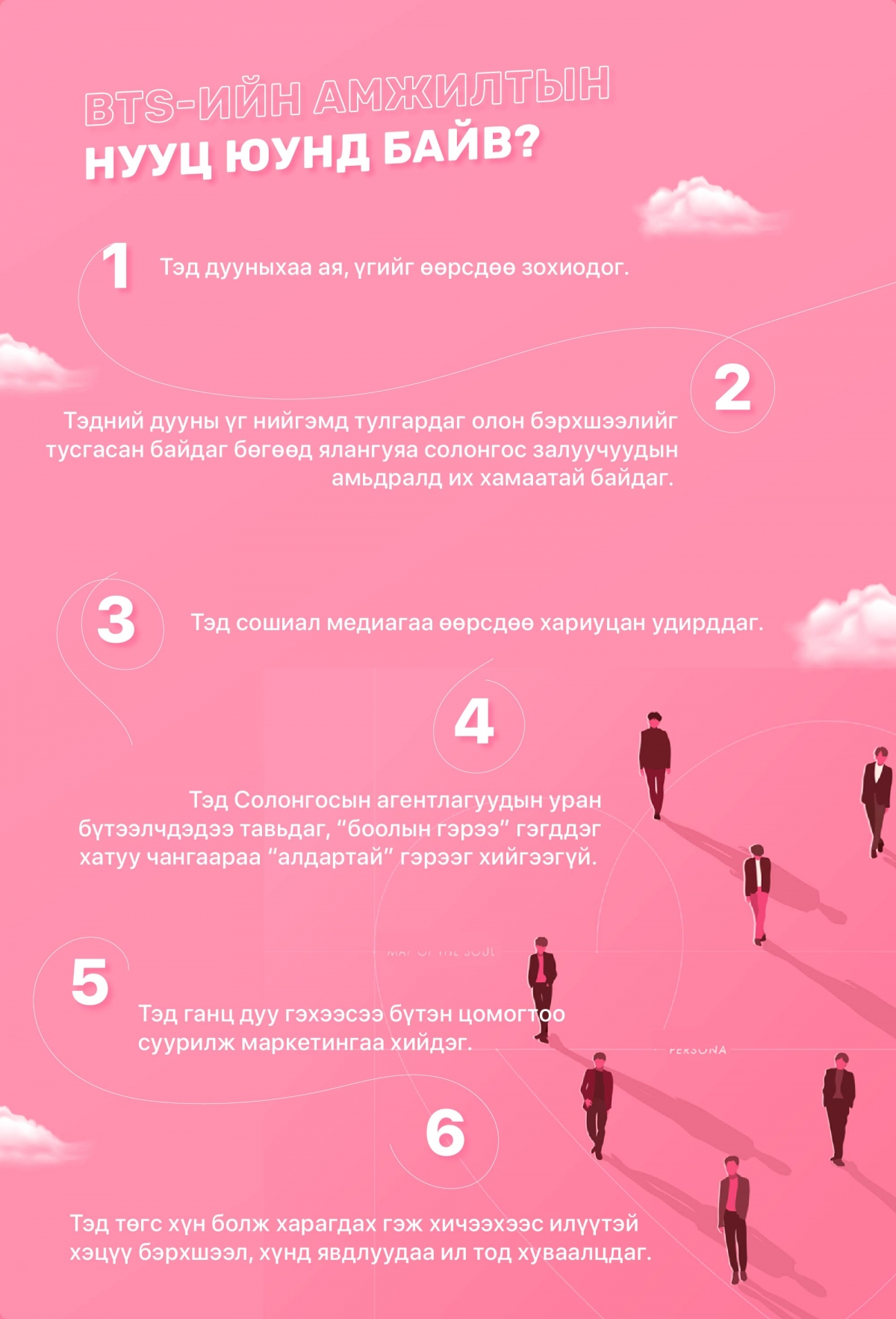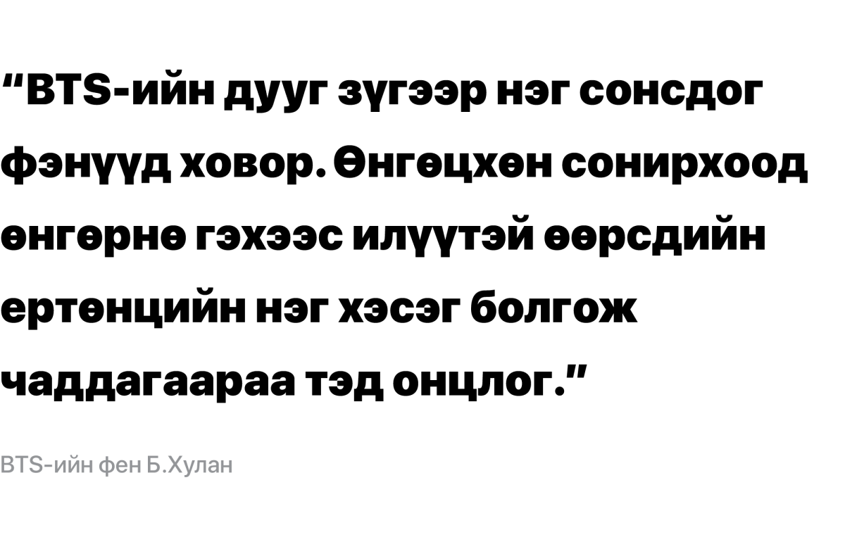 Анх удаа л ийм сайн бичсэн bts ийн талаарх монгол нийтлэл уншлаа үнэхээр сэтгэл хангалуун байна. Үүнийг бичсэн сэтгүүлч таньд баярлалаа❤️