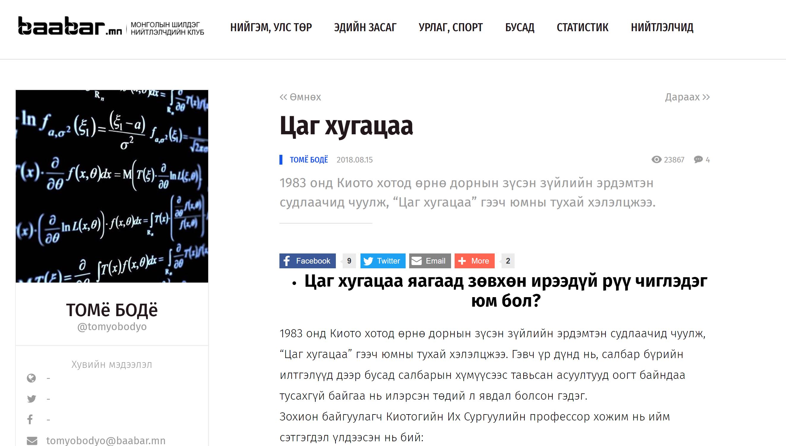 Шинжлэх ухааныг энгийнээр тайлбарлаж, уншигчдын оюуны боловсролд тууштай, тогтмол хувь нэмэр оруулсаар буй "Томё Бодё" блогоос бид ээлжит сонголтоо хийлээ. 8 дугаар сард нийтлэгдсэн "Цаг хугацаа" нийтлэл бол аль ч чиглэлийн ямар ч мэдлэгтэй хүн уншвал зохимжтой, дараа нь хэлэлцүүлэг өрнүүлж улам ихээр ярилцах ёстой сэдвийг хөндсөн агуулга. "Цаг хугацаа яагаад зөвхөн ирээдүй рүү чиглэдэг юм бол?" гэж нийтлэлч танаас хэд хэдэн удаа асууна. Эхний хариултаа сүүлийнхтэйгээ харьцуулаад нэг үзээрэй.