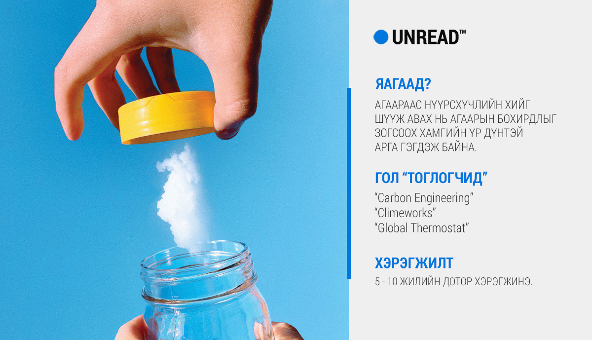 Агаараас нүүрсхүчлийн хийг шүүх технологи нь хүлэмжийн хийг бууруулах, агаарын бохирдлыг үгүй хийх хамгийн сонгодог арга хэмээгдэж байна. Хүн төрөлхтнөөс хамааралтай дэлхийн дулаарал гол ярианы сэдэв болж буй одоогийн нөхцөлд энэхүү технологи том "тэсрэлт" болох нь гарцаагүй. Бид энэ зуундаа багтаж 1 триллион тонн нүүрсхүчлийн хийг агаараас гаргаж авах зайлшгүй шаардлагатай байгаа юм.