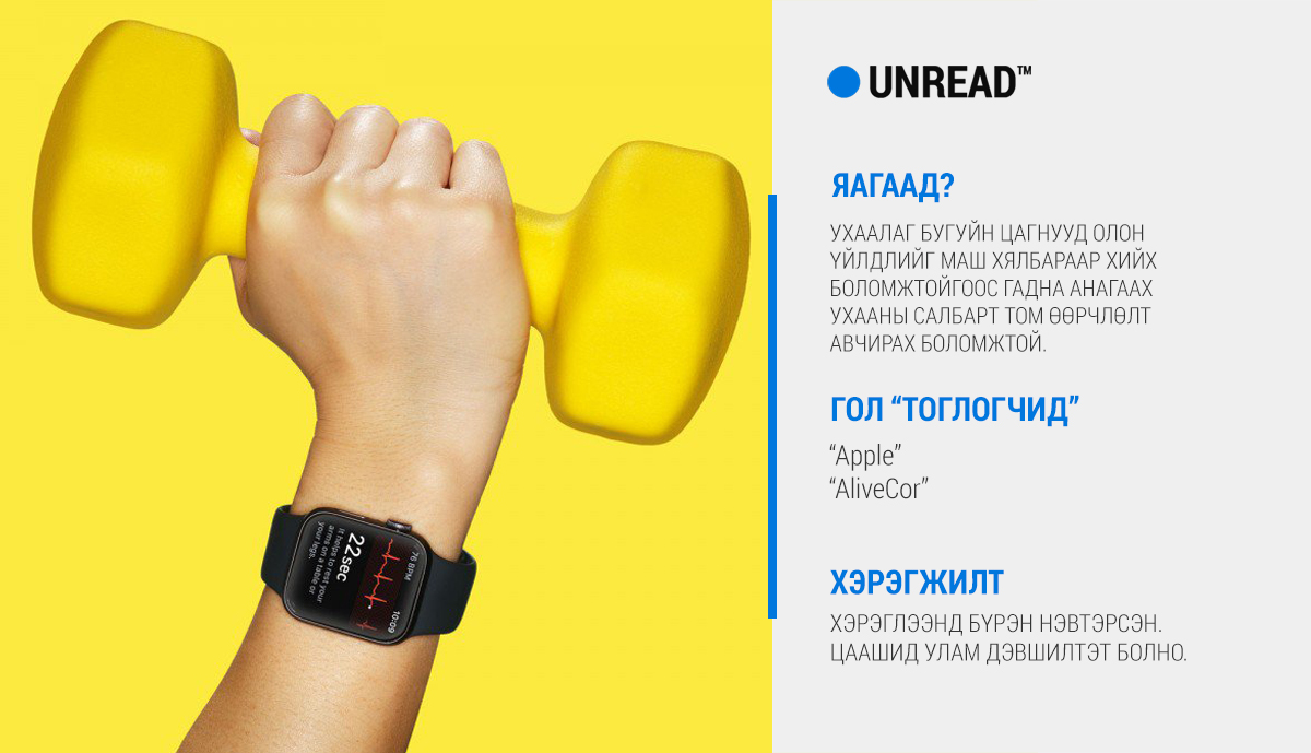 Ухаалаг бугуйн цаг хөгжүүлэгчид эрүүл мэндээ бугуйгнаасаа хянадаг боломжийг улам л дэвшилтэт болгохоор зорьж байна. Бугуйн цагнаасаа хүн зүрхний үйл ажиллагааныхаа анализыг харах нь тийм "цочирдом" зүйл биш ч эрүүл мэндэд, эмчилгээний чиглэлд маш өндөр хувь нэмэр оруулж байгаа юм.