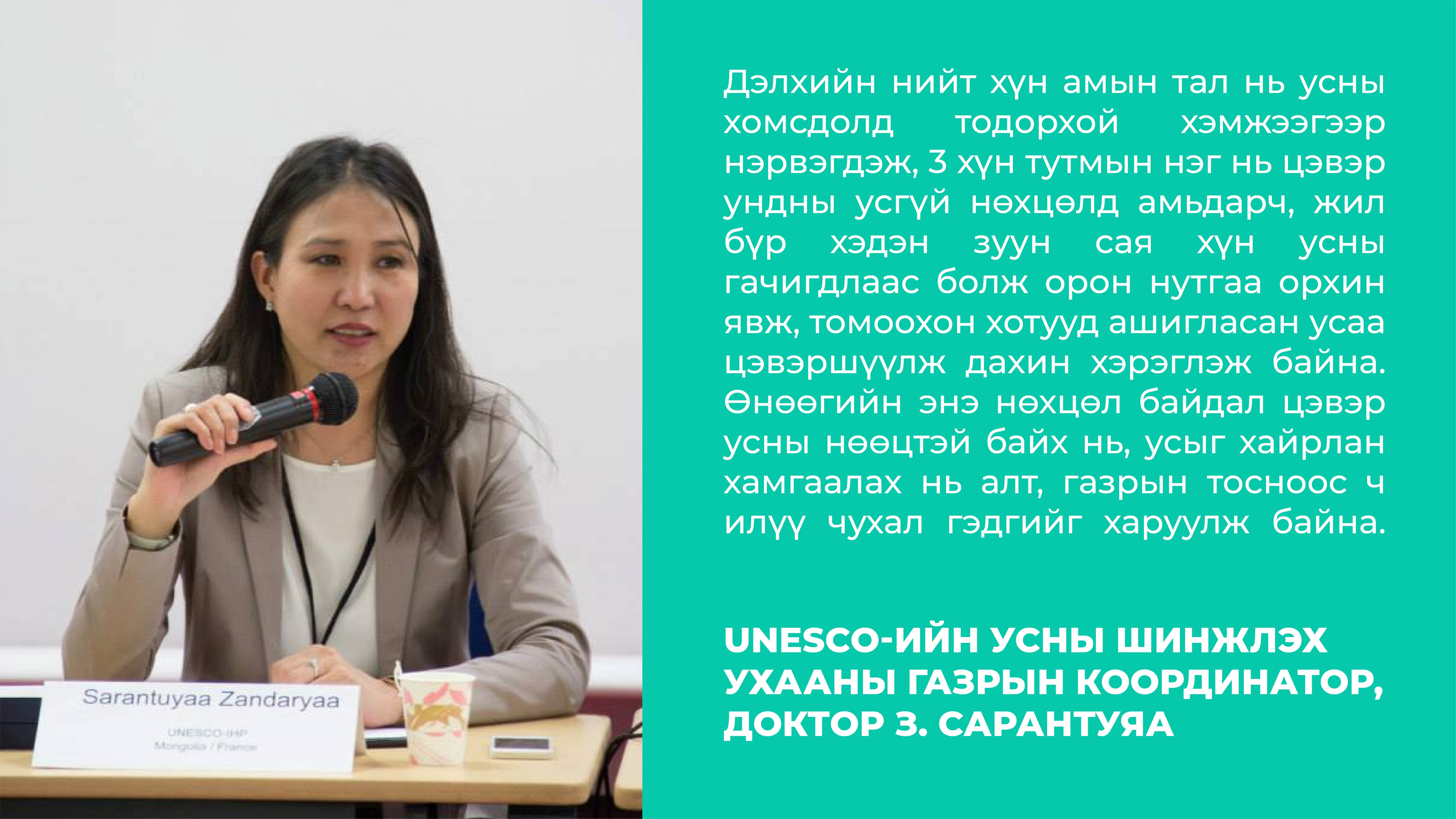 Заавал нүүр тулж, зовлонг нь биеэр туулж байж санаа зовниж, үйлдэл хийж эхэлдэг уламжлалыг бид эвдэх нь зүйтэй. Жил бүрийн усны өдрийн уриалга, тоо баримтуудаас усны гачигдал, баталгаагүй уснаас үүсэх эрсдэл нүүрлэх нь гарцаагүй буюу маш ойрхон буйг хялбархан харж болно. Дээр дурдсан тэрбумаар тоологдох хүмүүсийн амьдралыг шийдэх, ерөөс энэ дэлхийн бүх хүнтэй хамаатай асуудал учраас Тогтвортой хөгжлийн зургаадугаар зорилгод “Баталгаат ундны ус, ариун цэврийн байгууламжаар хангах” хэмээн тусгасан байдаг.