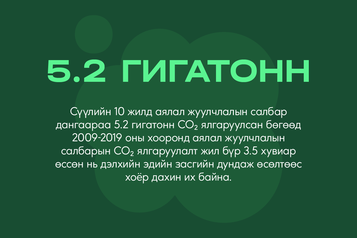 Сүүлийн 10 жилд аялал жуулчлалын салбар дангаараа 5.2 гигатонн CO₂ ялгаруулсан бөгөөд 2009-2019 оны хооронд аялал жуулчлалын салбарын CO₂ ялгаруулалт жил бүр 3.5 хувиар өссөн нь дэлхийн эдийн засгийн дундаж өсөлтөөс хоёр дахин их байгаа нь ноцтой асуудал болоод буй. Үнэндээ жилдээ нэг удаа төлөвлөн байж явдаг аяллаа байгальд ээлтэй эсэхийг бодох утгагүй санагдаж магадгүй. Эгэл бидний аяллаас илүү хувийн онгоцоор жилд хэдэн зуун удаа нисэх “баячууд”, томоохон компаниудад л хариуцлага тооцохдоо анхаарах нь зүйтэй байж болох юм. Дэлхийн CO₂ ялгаруулалтын 70%-ийг ердөө 100 том корпорац бүрдүүлдэг хэмээх баримт ч бий.