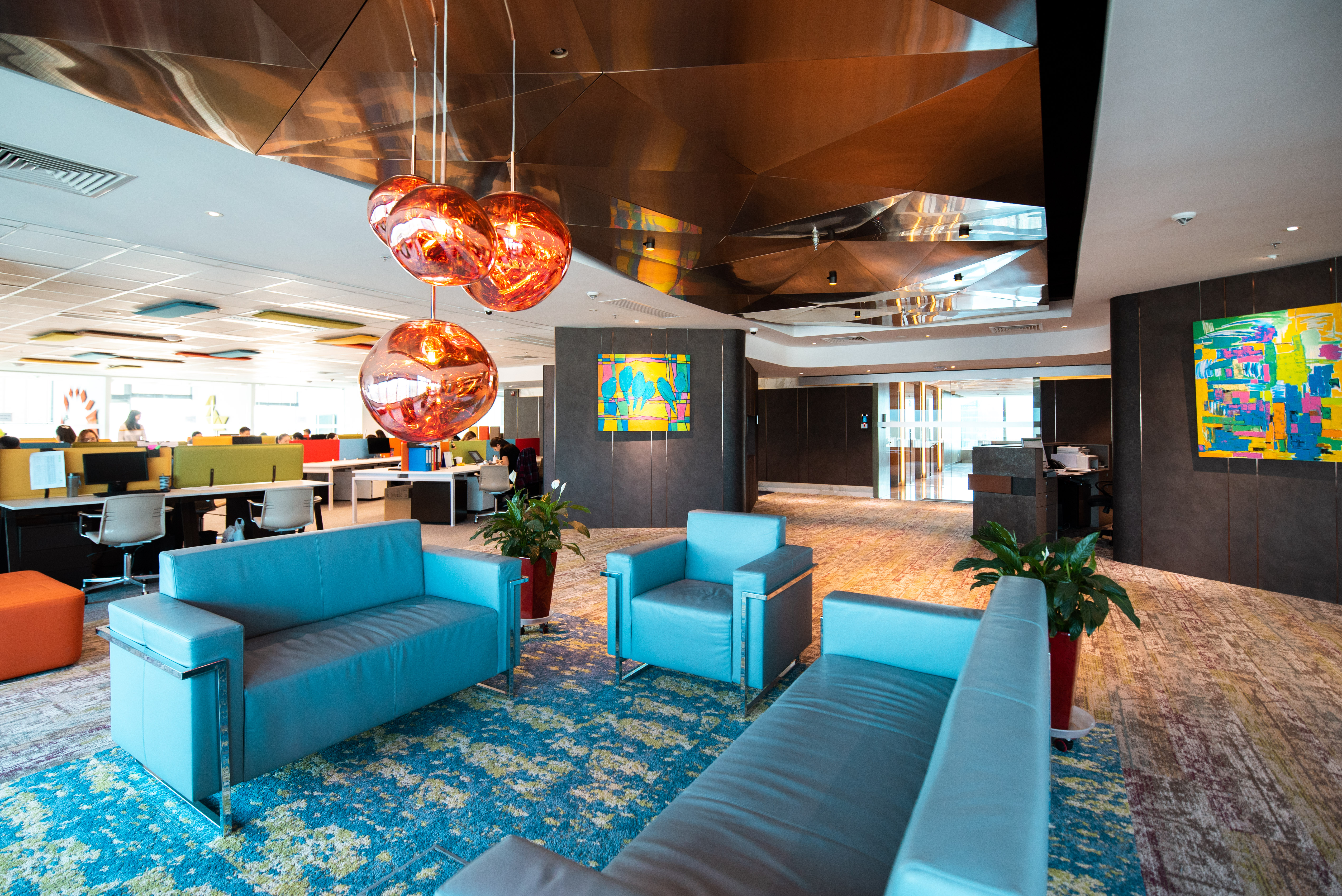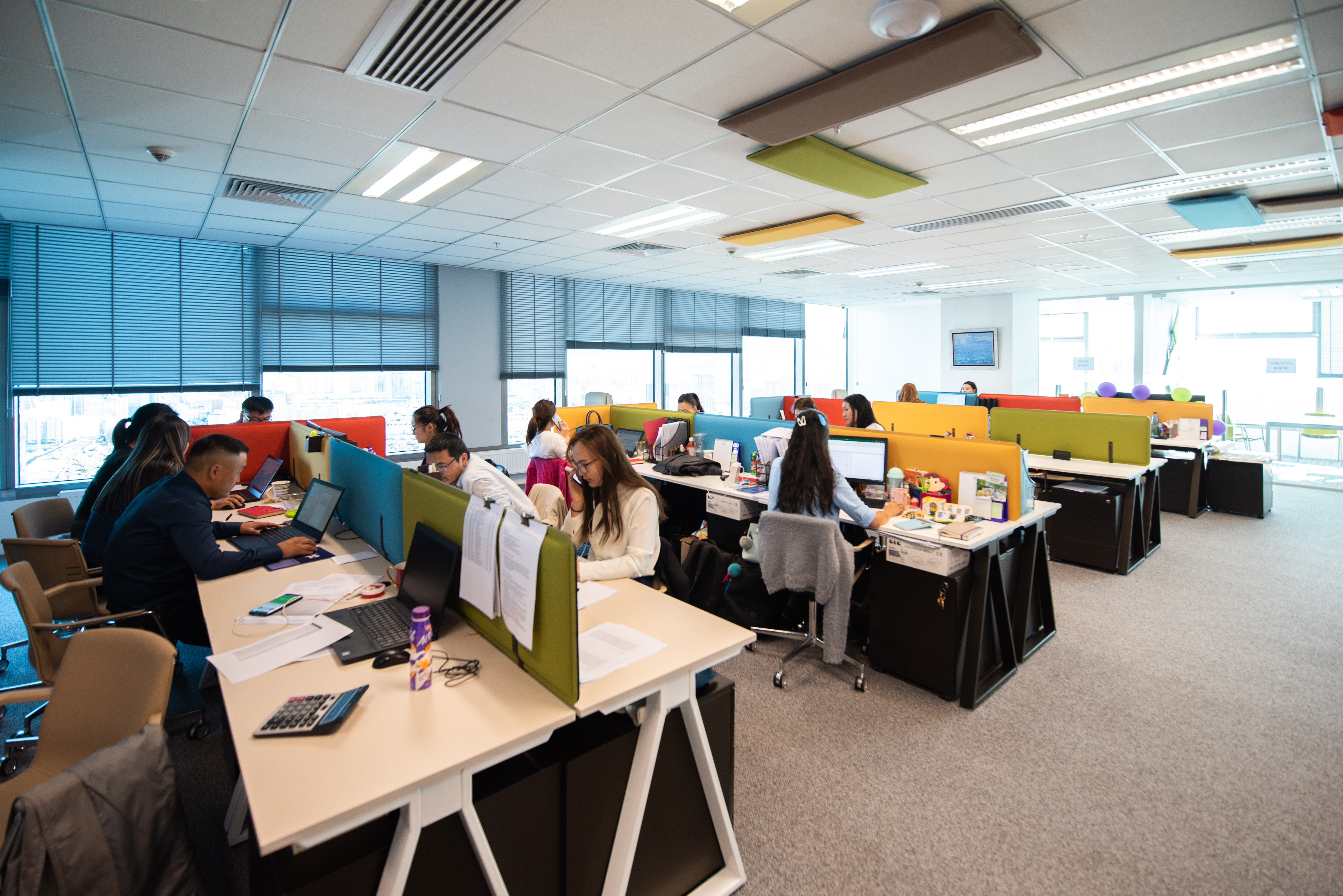 Ажилчдынхаа бүтээлч сэтгэлгээнд эерэгээр нөлөөлөх зорилгоор шар, улаан, ногоон зэрэг олон өнгөний шийдлийг оффисынхоо олон тохижилтод “шигтгэж” өгчээ. Тухайлбал, амралтын сандал, буйдангууд болон ажилчдын ширээ хоорондын тусгаарлагчийг олон өнгөөр тохижуулсан бол оффисын ханыг цагаан, саарал өнгөөр дагнан, цулгуй болгожээ. Байгалийн өнгө аясыг мэдрүүлэхийн тулд үүдэн хэсгийг хад чулууны өнгө бүхий эко хавтангаар бүрсэн бол бусад хэсгийг цагаан өнгөөр дагнан аль болох цэвэрхэн цэлгэр харагдуулахыг зорьсон ажээ. Ханыг ийнхүү цулгуй өнгөөр дагнасан учраас өнгөлөг уран зургуудыг сонгож өлгөсөн нь үнэхээр таалагдав.