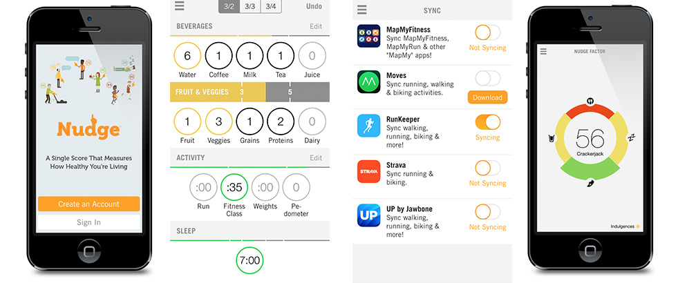 Nudge бол таны хэрэглэж буй хүнс, хийж буй дасгалуудын үзүүлэлтийг нэг цэгт төвлөрүүлдэг апп юм. Идэж буй хоол, ууж буй ундаанаас эхлээд бүх төрлийн хоолтой холбоотой мэдээллээ оруулснаар энэ апп танд зохимжтой калори ба тоо хэмжээг хэмжиж, хянаж, тохируулж өгөх болно. Гүйлт, алхалт, хийсэн дасгалын тоо, бүр өдөр тутам авч буй нойрны хэмжээгээ тогтмол оруулаад байвал энэ апп таны амьдралын хэв маяг ямар түвшинд байгааг, юуг илүү хийж, юуг сайжруулбал зохих талаар мэдээлэл өгөх болно. Дээр дурдсан Moves болон их хэрэглэгддэг Runkeeper зэрэг апп-уудтай шууд холбогддог давуу талтай. Хэрвээ найзуудаа урьж оруулж чадвал бие биенийхээ үзүүлэлтийг хянаж, хамтдаа өрсөлдөнгөө хөгжих боломжийг олгох болно.