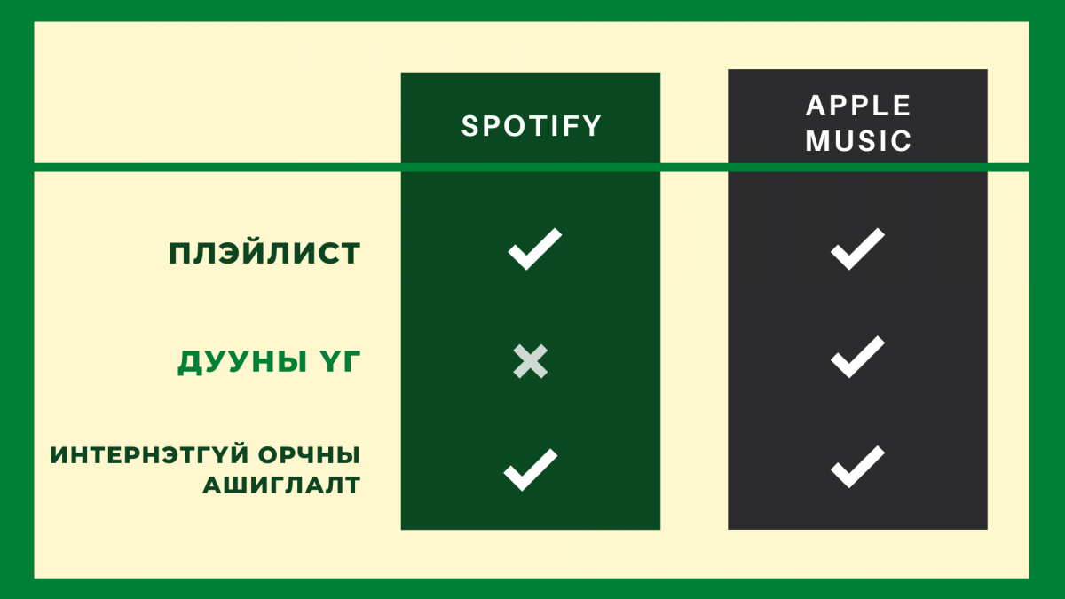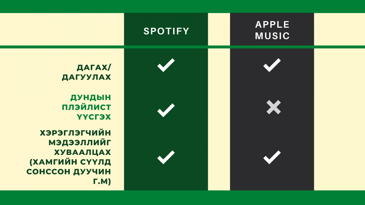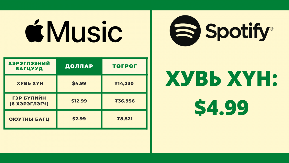 Үндсэн горимдоо Apple Music, Spotify хоёул төлбөрийн 3-4 багцын сонголттой боловч Монгол дахь хэрэглэгчдэд Spotify ганцхан төлбөрийн нөхцөл санал болгож байгаа билээ.