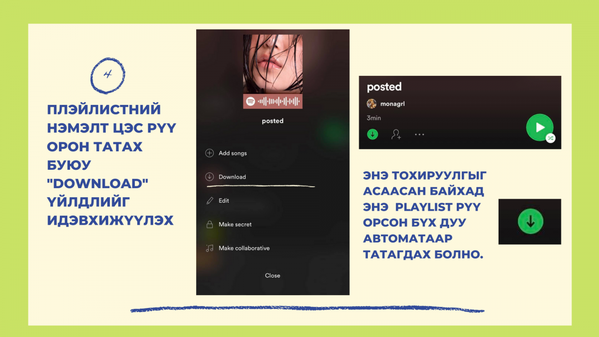 4. Плэйлистийн нэмэлт цэс (гурван цэг) рүү орон "Download" буюу татах үйлдлийг идэвхжүүлнэ. Ийн тохируулснаар эл плэйлистэд нэмсэн дуу бүр автоматаар татагдана.