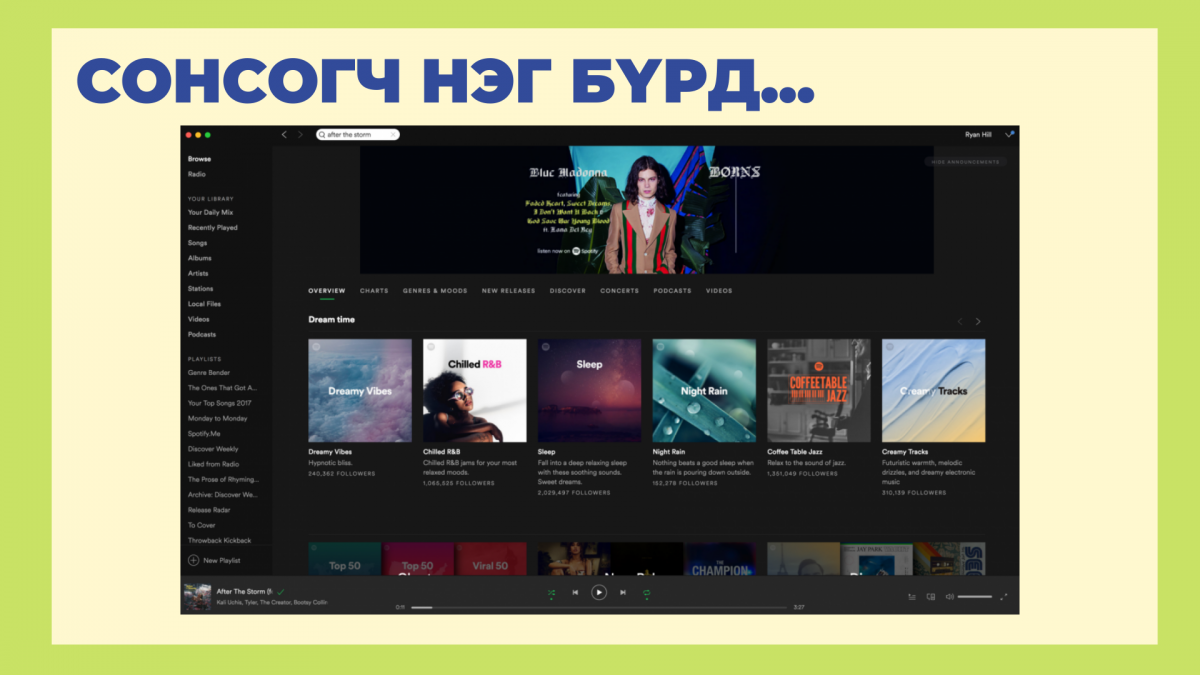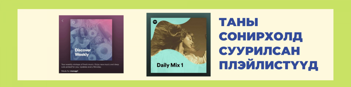 Нүүр хуудаснаасаа эхлээд л Spotify хэрэглэгчдэдээ асар олон төрлийн плэйлист санал болгодгийг хэрэглэж үзсэн нэг нь мэдэх биз ээ.