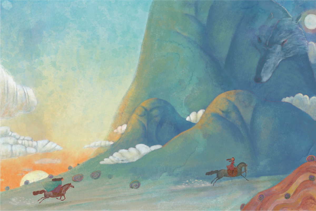 Наран улбар туяагаа тэнгэрийн хээлээр цацан дэвссээр жаргаж буй агшинд зохиолын гол дүрүүд говийн толгод дундуур хурдлан давхиж явна. Зохиолд энэ агшинд чоно улих чимээ дуулддаг. Тиймээс ч толгодыг аварга том хадан цохио мэтээр зурагт тодосгон үзүүлж, тэндээс ургав уу гэлтэй чонын толгойг дүрслэн гаргажээ. Наран жаргах зүгийн газрын байдал, тэнгэрийн өнгө номин ногооноор солонгорон байвч нөгөө талд саран ургаж, толгодыг цэнхэр туяагаар сүлжээ. Хүүхдүүдэд шөнө улих чонын дуу айдас төрүүлэх нь мэдээж. Тиймээс ч толгод хадан цохио мэт өндөр, тэр л цохио, толгодын чинадаас айдсыг нь төлөөлж байх шиг аварга том чоно дүүлэн гарч ирэх мэт санагдана.