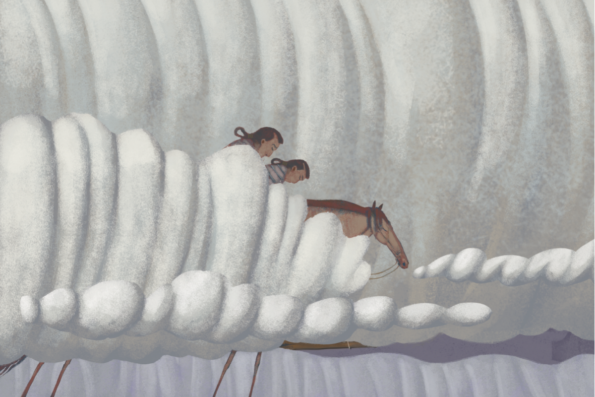 Үүн дотроос хамгийн онцлууштай нь тулаанд шархадсан Өгөдэйг Борохул мориндоо дүүрэн гэртээ харьж буй зураг юм. Дайн тулааны хөлөөс боссон гэмээргүй хөвсгөр их үүлсийн дундуур хоёр эр, ганц моринд нэгнийгээ дүүрэн сажлуулж явна. Морь ч тэр, эзэд ч тэр ядарч туйлджээ. Үүлсээс өөр нүдээрээ тэмтрэх зүйлгүй ахуйг ийнхүү дүрсжүүлэн буулгасан нь туульс, домгийн зургийн өнгө аясыг санагдуулаад зогсохгүй хэдийгээр Өгөдэй шархадсан боловч хүндхэн тулалдаан дууссаны дараах нэгээхэн агшны анир гүмийг бэлгэдсэн мэт мэдрэмж төрнө.