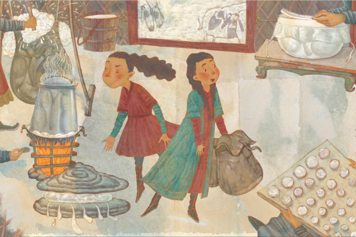 Харин өөр нэгэн онцлох зураг бол хүүхдүүдэд эмээ нь ааруул өгч буйг дүрсэлсэн хэсэг юм. Гэрийн доторх эд зүйлс, хаалганы цаана үзэгдэх хонин сүрэг, ааруулыг гаргаж авахад хэрэгтэй бүхэн цөм нэгэн дэвсгэрт багтжээ. Тулганд бадамлах гал, түүний дээр буй бүрхээр тогоо, айрагны хөхүүр гээд эд юмсыг өөрсдийн гэсэн дүр төрхтэй болгож бүтээсэн байна. Зургийн ерөнхий дэвсгэр нь шаргалдуу өнгөтэй бөгөөд гэр дотор зулж дэвссэн эсгий уншигчийн төсөөлөлд бууна.