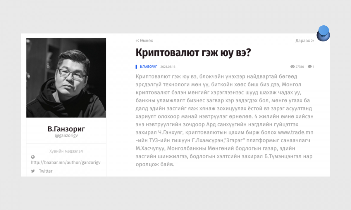 Монголчууд ч энэ чиг хандлагаас хоцорсонгүй. УИХ Виртуал хөрөнгийн үйлчилгээ үзүүлэгчийн тухай хуулийг баталснаар төр засаг ч энэ чиглэлд боломжийн хурдан хөдөлсөн юм. Магад хүн болгоны ярьж хэлэлцсээр байгаа мэт санагдах криптовалют, крипто бирж, NFT, блокчейн зэрэг ойлголтуудыг тайлбарлахаар нийтлэлч В.Ганзориг салбарын экспертүүд, гол тоглогчдыг урин цуврал хэлэлцүүлэг өрнүүлж, цэгцтэй мэдээлэл өгснийг онцолж байна.