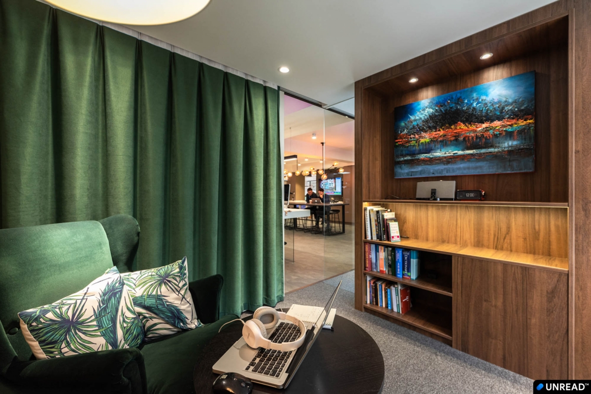 Хуучин оффист байхдаа алба хэлтэс, нэгжүүдийг тусгаарласан ханыг нураан, нээлттэй орчин бүрдүүлсэн нь ажилчдын хамтач соёлыг нэмэгдүүлснээс гадна олны дунд үг, үйлдлээ цэгнэн, үргэлж эерэг энерги түгээх нөхцлийг бий болгожээ. Энэ санаагаа барин шинэ оффисоо тохижуулахдаа өдөр бүр давтагдах уйтгартай ажлын орчныг илүү сонирхолтой болгохын тулд кофе шоп мэт уур амьсгалтай дундын оффисыг бүтээсэн байна. Өнцөг булан бүрийг өөрөөр тохижуулан, хүссэн газраа суун ажиллах боломжтой болгож, хаана ч суусан өөр мэдрэмж өгөх, уйдахааргүй орчныг бүрдүүлж чадсан нь харагдаж байлаа. Хамтдаа ярилцаж гаргасан оффисын шийдэл, санааг Amaze Design-ийн хамт олон чадварлагаар зураглан бодит болгожээ. “Тэд биднийг маш сайн ойлгож, гүйцэтгэлийг өндөр чанартай хийсэн. Манай оффисоос хичнээн хайгаад ямар ч өө сэв олохгүй” хэмээн захирал нь бахархалтай өгүүлж байв.