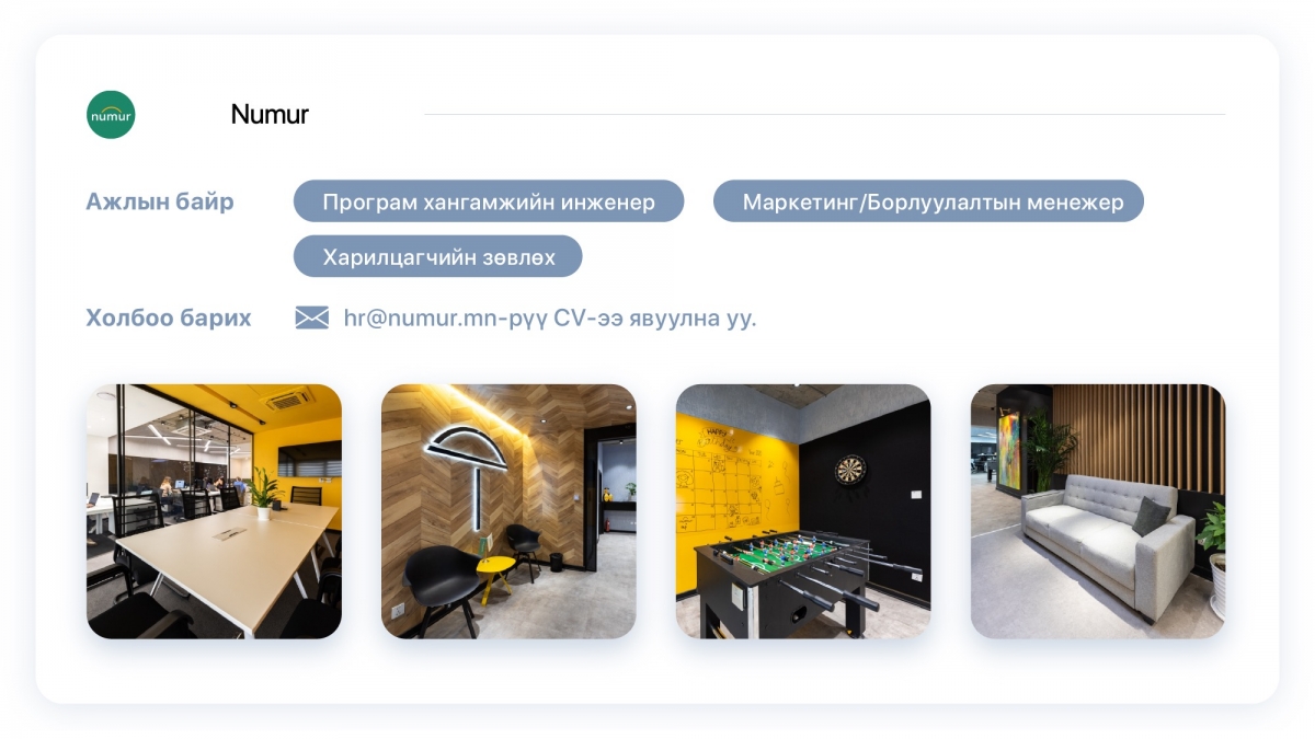 Сэтгэл сэргээм цоглог өнгө, сонирхол татам деталиуд, харагдах орчны үзэмж, амарч тухлах хэсэг, орчин үеийн технологийн шийдлүүд, шинэ шийдлийг эрэлхийлсэн тохижилт... Энэ бол "Нөмөр"-ийн оффис. Ажлын байр гэдэг бүтээмжтэй ажиллахад хэчнээн чухал болохыг энэ багийнхны сэтгэл ханамж, оффисын уур амьсгалаас мэдэрлээ.