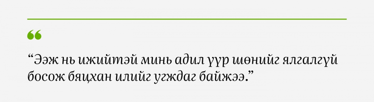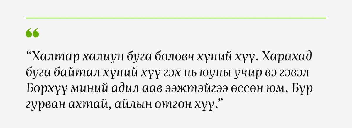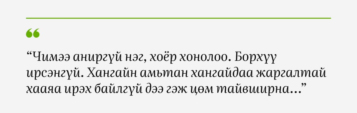 “Борхүүгийнхээ түүхээр ном бүтээх хүсэлдээ хөтлөгдөн таван жилийн өмнө гэрийг нь зорьж байсан бол өнөөдөр биеллээ оллоо. Хүүгээ, дүүгээ санаж санаж мөрөөсөж, хол ойроос чимээ чагнан үгүйлэн суудаг аав, ээж, ах дүү нар нь нүүр тулан уулзаж чадахгүй ч гэсэн энэ номоор дамжуулан дахин уулзах боломж олдсонд туйлын их баярлаж бас догдолж байна. Магадгүй уншигч олон минь ч гэсэн их үгүйлсэн биз ээ” - Зохиолч Б.Минжбадамгарав