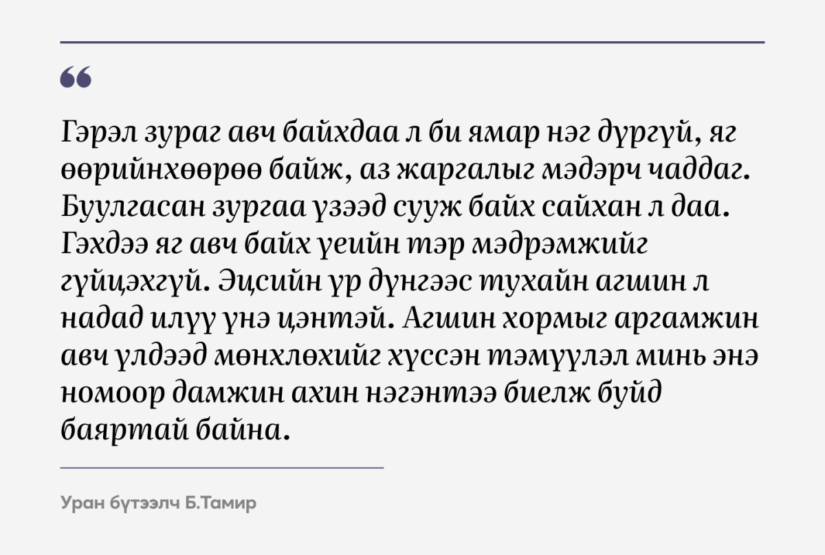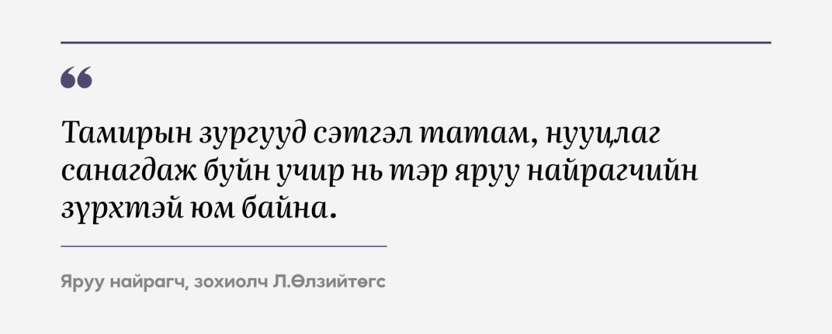 Хотын их хөл хөдөлгөөн, тасралтгүй үргэлжлэх чимээ шуугиан дунд бид өөрсдийгөө сонсох сөхөөгүй явсаар л. Гэвч амьдрал ийм хурдтай эргэлдэх тусам бидний дотоод ертөнц алсран холдож, нэг л мэдэхэд өөрийнхөө мөн чанараас төөрч орхисон байх нь олонтоо. Угтаа хүн бүрийн сэтгэлийн гүнд хэзээ ч хөндөгдөөгүй, зөвхөн аниргүй дунд л тодорч үзэгддэг нандин орон зай бий бөгөөд тэр л оршихуйд жинхэнэ амар амгалан, өөрийгөө таних тайтгарал нуугдаж буй биз ээ.