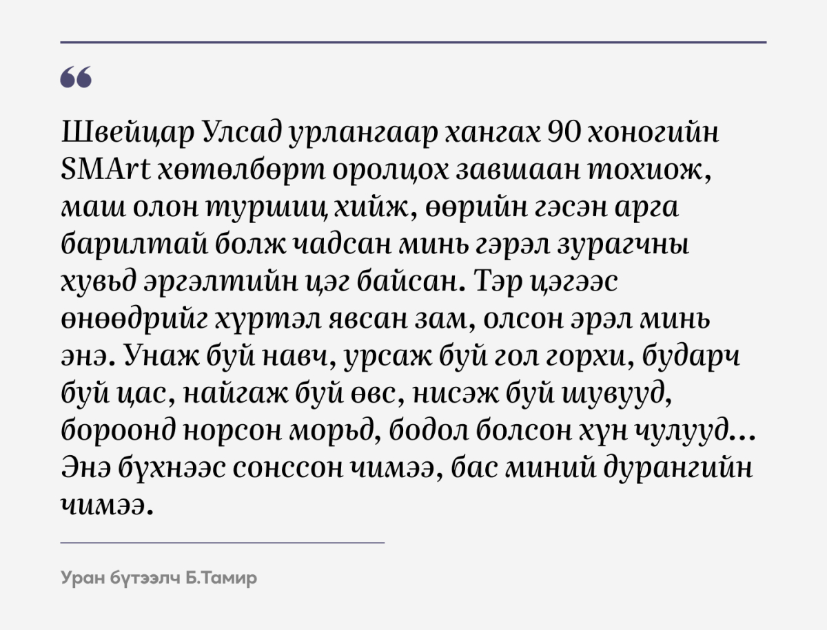Мөн номын цаас, хэвлэлийн чанар нь зураг бүрийг амилуулж, дэлгэцээс авч чадахгүй мэдрэмжийг өгч байв. Завгүй ажлын дундуур хэдхэн минут энэ номыг дэлгээд суухад бодол санаа өөр зүйлд сатаарч, уран бүтээлчийн адилаар энэ дүр зургийг нүдээр харсан сан бол гэж эрхгүй бодогдоно. Тэгж хүсэхдээ ер нь эргэн тойрон дахь зүйлсээ би хэр сайн анзаарч байгаа талаар ч бодож амжив. Энэ бол зөвхөн гэрэл зургийн цуглуулга биш, дотогшоогоо өнгийх боломж олгох нандин бүтээл аж. Цаг зав гарган үзэсгэлэнгээр нь ороод гарахыг санал болгоё.