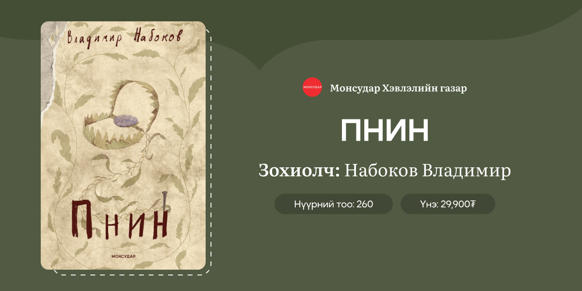 Владимир Набоковын тэртээх 1955 онд алдарт “Лолита” зохиолоо бичсэнээс хойш ердөө хоёр жилийн дараа туурвисан бүтээл бол “Пнин.” Зохиолын гол дүр болох 1950-аад онд Ленинизмийн дэглэмээс зугтан АНУ-д цагаачлан ирсэн орос профессор Тимофей Пнин шинэ орчинд ирээд тоо томшгүй олон сорилт, бэрхшээлийг даван туулах шаардлага гардаг. Уншигчид Пнинийг Набоковын хамгийн алиа, хөгжилтэй атлаа сэтгэл хөндүүрлүүлэм дүр хэмээдэг нь зохиолчийн элэглэл, эмгэнэл хосолсон дүрслэлээр баялаг бичиглэл, хэл найруулгыг давхар өргөмжилдөг гэлтэй.