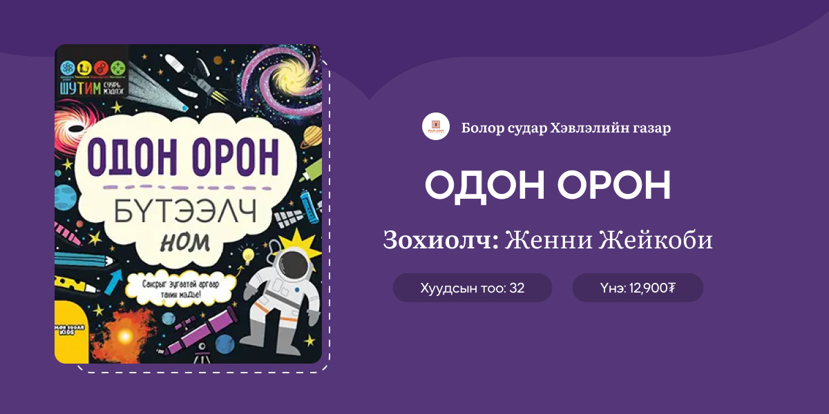 ШУТИМ (Шинжлэх Ухаан, Технологи, Инженерчлэл, Математик) цувралын ээлжит нэгэн бүтээлч ном энэ удаа одон орон, гараг эрхсийн тухай мэдлэгээ зузаатгахад тус болно. Зуу, зуун гэрлийн жилийн хурдаар өрнөж байдаг сансар огторгуй дахь хувьсан өөрчлөлтүүд, томоохон элементүүд, сансрын нисгэгчид зэрэг төрөл бүрийн сэдвээрх сонирхолтой баримтуудын аялал гараарай. Мөн мэдлэгээ бататгах зугаатай дасгалуудыг ажиллахаа мартуузай!