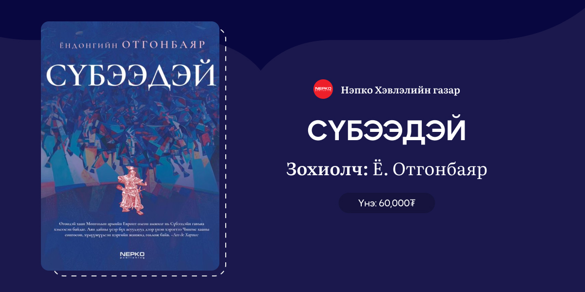 “Монголын гээгдсэн түүх” цувралын зохиолч, түүхч, дипломатч Ёндоны Отгонбаярын эл бүтээл нь XIII зууны Их Монгол Улс төдийгүй өнөө цагийн тив дэлхийд шагшигддаг алдарт Сүбээдэй баатрын намтрыг түүний дайн тулааны стратеги, түмэн олныг удирдан чиглүүлэх арга барил, цэргийн нарийн ухаантай хамтатган өгүүлжээ.