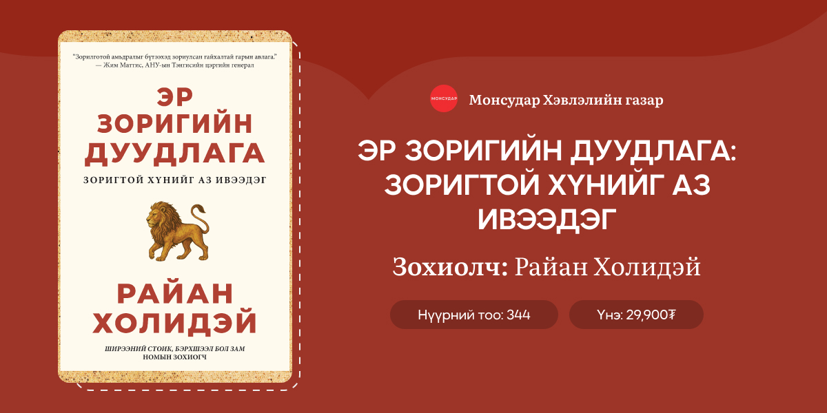Дэлхий даяар олон сая уншигчдыг байлдан дагуулсан зохиогч Райан Холидэйн эр зоригийн тухай бодит хүмүүсийн жишээгээр тайлбарлан бичсэн “Эр зоригийн дуудлага” ном дөнгөж өчигдөрхөн монгол уншигчдын гар дээр очлоо. Тус номд Эртний Спартагийн дайчдаас эхлээд Иргэний эрхийн хөдөлгөөн, хэвшмэл ойлголтыг эвдсэн удирдагчид болон Шарль де Голль, Флоренс Найтингейл зэрэг түүхэн хүмүүсийн амьдралаар дамжуулан эр зориг хэрхэн хувь хүн төдийгүй бүхэл бүтэн нийгмийг өөрчилж чаддаг тухай тун сонирхолтой өгүүлсэн байдаг.