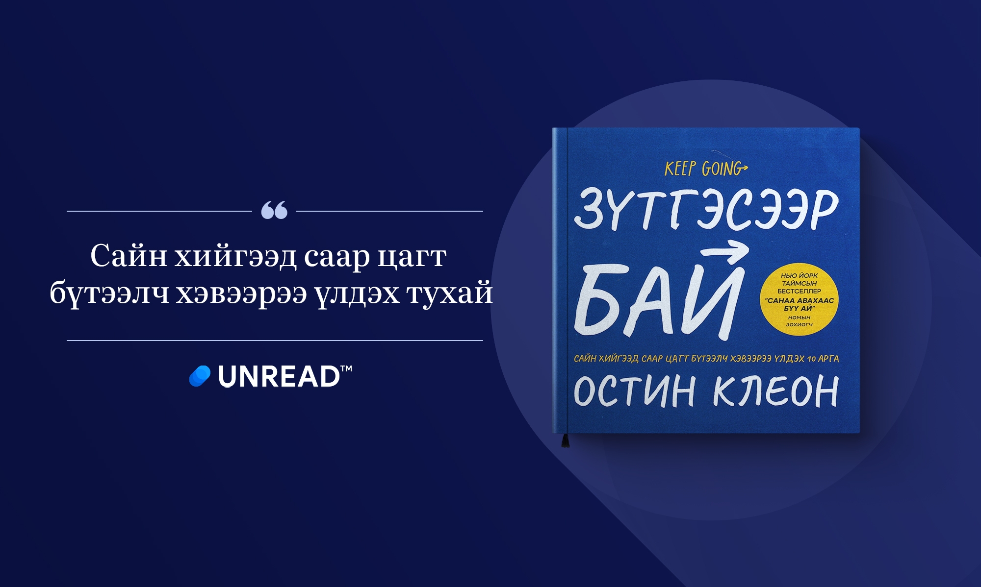 Манай Unread media компанийн хамтран үүсгэн байгуулагч Д.Ганзориг ээлжит номоо орчуулан уншигч олны хүртээл болгож буй нь Остин Клеоны “Зүтгэсээр бай” ном юм. Тэрээр 2020 онд Остины “Санаа авахаас бүү ай”, 2023 онд “Ажил бүтээлээ дэлгэ” номуудыг тус тус орчуулан гаргасан ба ийнхүү гурамсан бүтээлийн сүүлийн ном болох “Зүтгэсээр бай” нь монгол уншигчдын гарт хүрчээ.