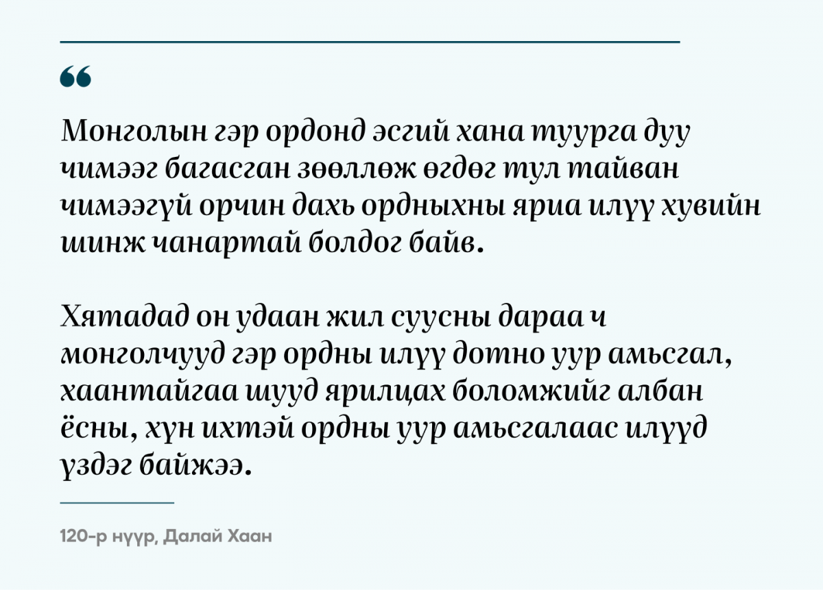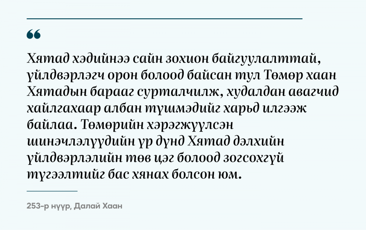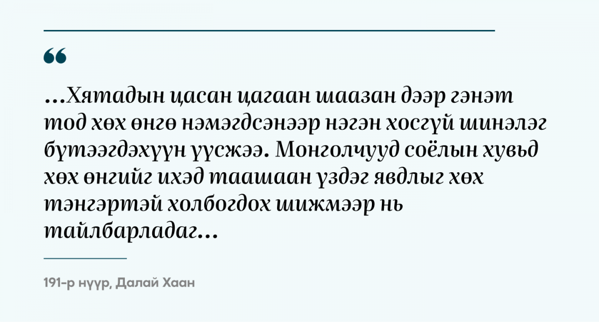 Эцэст нь, “Далай хаан: Хятадыг үндэслэгч Хубилай Сэцэн” бүтээлийг Хубилай хаан, түүний далай тэнгисийг эрхшээсэн түүхээр дамжуулан монгол үндэстний дэлхийн хөгжилд оруулсан хувь нэмрийг өөртөө ахин нэг сануулахыг хүссэн орчин цагийн уншигч бүрд санал болгоё.