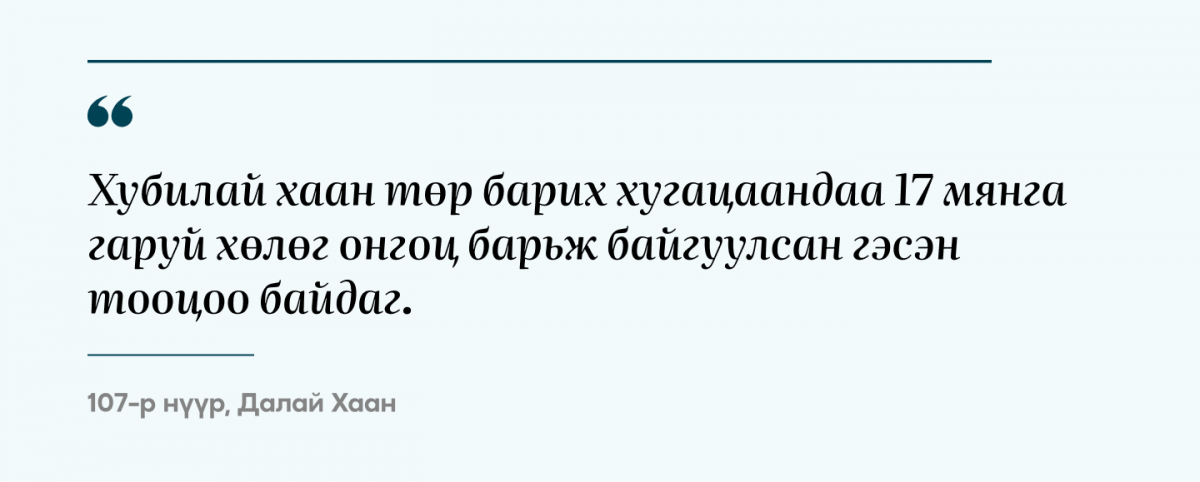 Их эзэн Чингис хааны ач хүү, алдарт Сорхугтани хатны хайрт хүү Хубилай нь Их Монгол Улсын зургаа дахь хаан бөгөөд эзэнт гүрний төвөө өнөөгийн Хятад, тэр дундаа Бээжин рүү шилжүүлж, тэндээ Юань Улсыг үүсгэн байгуулан 34 жилийн турш тогтвортой хаан суусан нэгэн юм. Хубилай хааны үүсгэн байгуулсан Юань улс нь тухайн үедээ дэлхийн хамгийн хүчирхэг усан флотыг удирдахын зэрэгцээ газрын зураг, байлдааны хөлөг онгоцыг ч бүтээж байжээ. Аав, ах, авга ах нарынхаа үйл хэргийг үргэлжлүүлэхийн сацуу нүүдэлчин монголчуудын урьд хожид хэзээ ч ойртож байгаагүй далай, тэнгист гарч, зөвхөн аян дайн бус худалдаа наймаа эрхэлсэн түүнийг “Хятадыг үндэслэгч” хэмээн тодорхойлдог судлаач, түүхчид цөөнгүй.