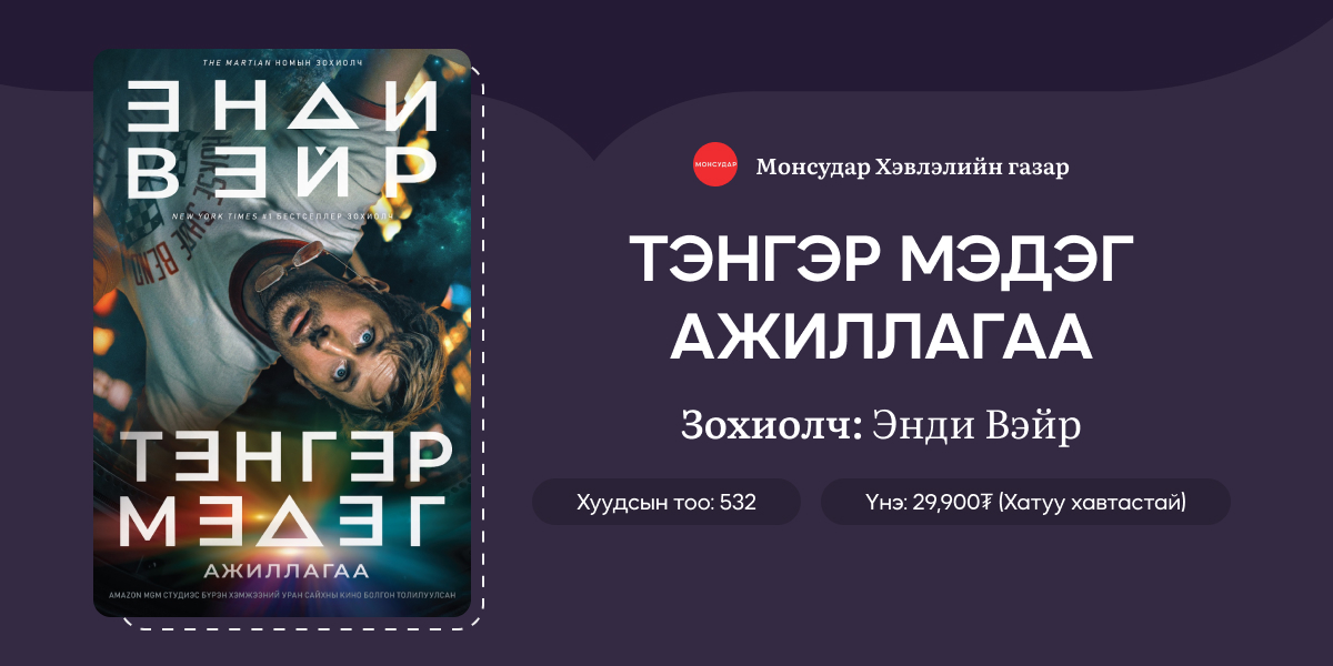 Энди Уирийн “The Martian” зохиол дэлхий даяар бестселлер болж, дэлгэцийн бүтээл болон сая сая хүнийг байлдан дагуулж байсан бол түүний 2021 онд гарсан “Project Hail Mary” нь уншигчдаас бүр өндөр үнэлгээ авч, шинжлэх ухааны зөгнөлт зохиолын орчин үеийн сор бүтээлээр нэрлэгдээд байсан билээ. Уг зохиолоос сэдэвлэсэн бүрэн хэмжээний кино нээлтээ хийж байгаатай холбогдуулан “Монсудар” хэвлэлийн газраас уг номыг “Тэнгэр мэдэг ажиллагаа” нэрээр шинэчлэн орчуулж, гаргасан байна.