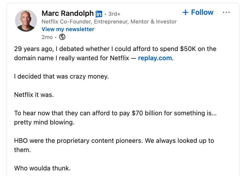 Угтаа геологич мэргэжилтэй Марк Рандолф 1997 оноос Netflix-ийн санаан дээр ажиллаж эхлээд 2003 онд өөрийнх нь ажил дууслаа гэж үзэн компаниа орхисон нэгэн юм. Хэдийгээр тэрээр Netflix-ээс гараад хоёр арваныг үдэж буй ч тухайн үедээ бодож төсөөлж байсан бүхэн нь өдгөө биеллээ олсноос нь харвал гайхалтай алсын хараатай нэгэн байжээ. Netflix шуудангаар DVD илгээдэг түрээсийн үйлчилгээ байсан ч тэд анхнаасаа интернэт эрчээ авах үед нь салбарынхаа Амазон болж, тэр үеийн Гигант Blockbuster-аа ч бут цохихоо мэдэж байж. Өөрөөр хэлбэл тэд, богино хугацааны орлогын төлөө бус урт хугацааны нөлөөллийн тоглоом тогложээ.