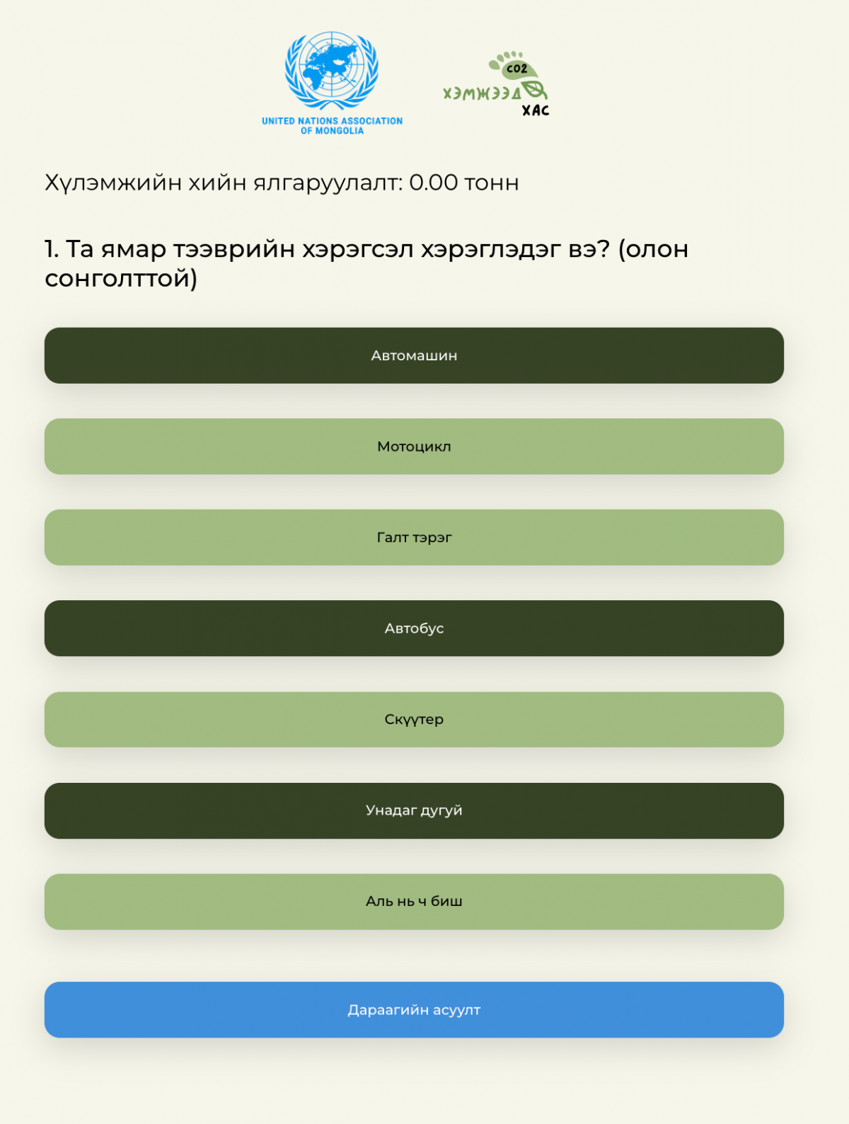 Та өөрийн өдөр тутмын амьдралын хэв маяг, дадал зуршилтай холбоотой 10 асуултад хариулж, нэг жилд хэчнээн тонн хүлэмжийн хий ялгаруулах үйлдэл, шийдвэр гаргаж буйг тодорхой мэдэх боломжтой.
