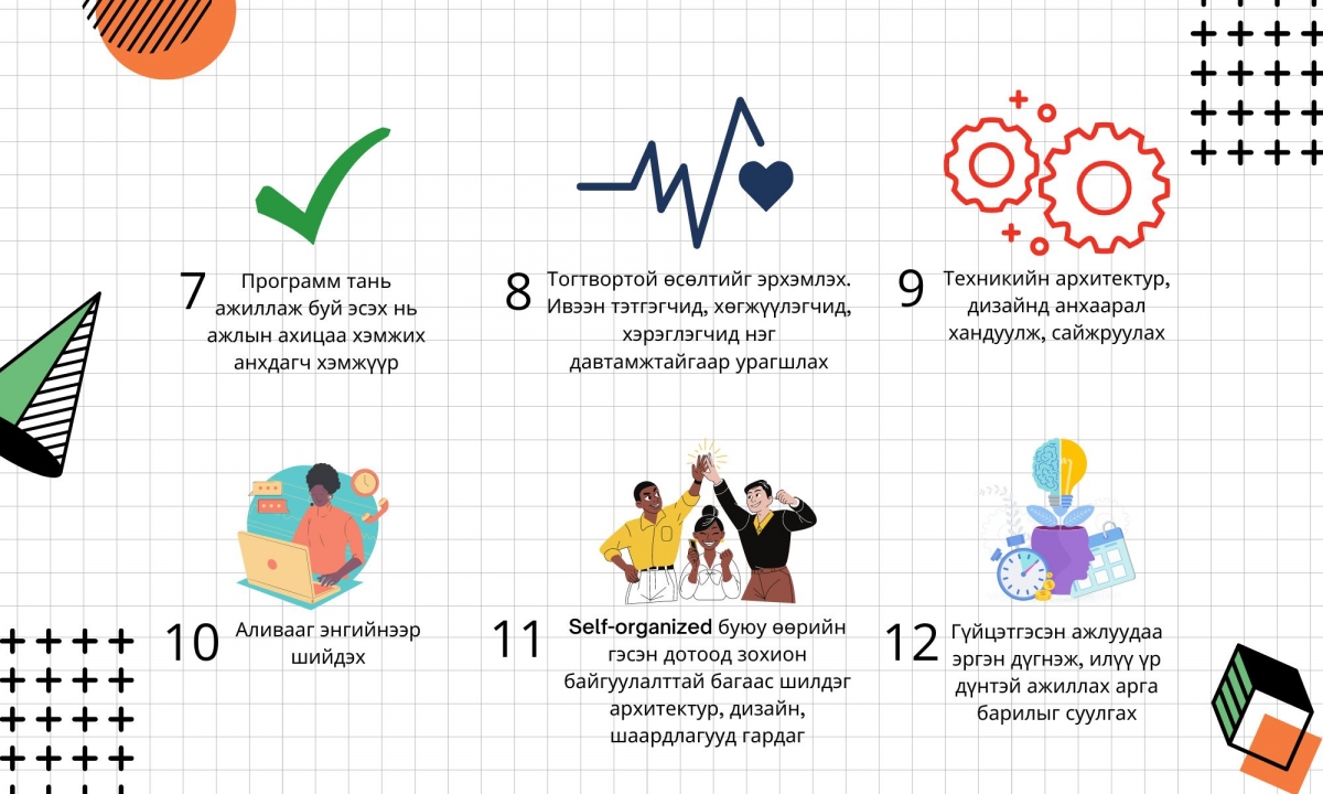 Үйл ажиллагааны дараагийн хэсэгт хөгжүүлэгчдэд зориулсан "Agile" гэх төслийн менежментийн 12 зарчмыг "Мобиком" корпорацийн программ хөгжүүлэлт хариуцсан менежер Ж.Магваншийрэв танилцууллаа. 2001 онд анх бичигдсэн энэхүү зарчмууд өнөөг хүртэл ач холбогдолтой хэвээр буй. Энэ нь зарчмууд бүгд хүний сэтгэлзүй дээр суурилсантай холбоотой хэмээн илтгэгч маань онцолж байв. Түүнчлэн уг зарчмуудыг тайлбарлахын өмнө "12 зарчмыг судалсан нь надад шууд болон шууд бус байдлаар ашиг тусаа их өгсөн" хэмээн онцоллоо.