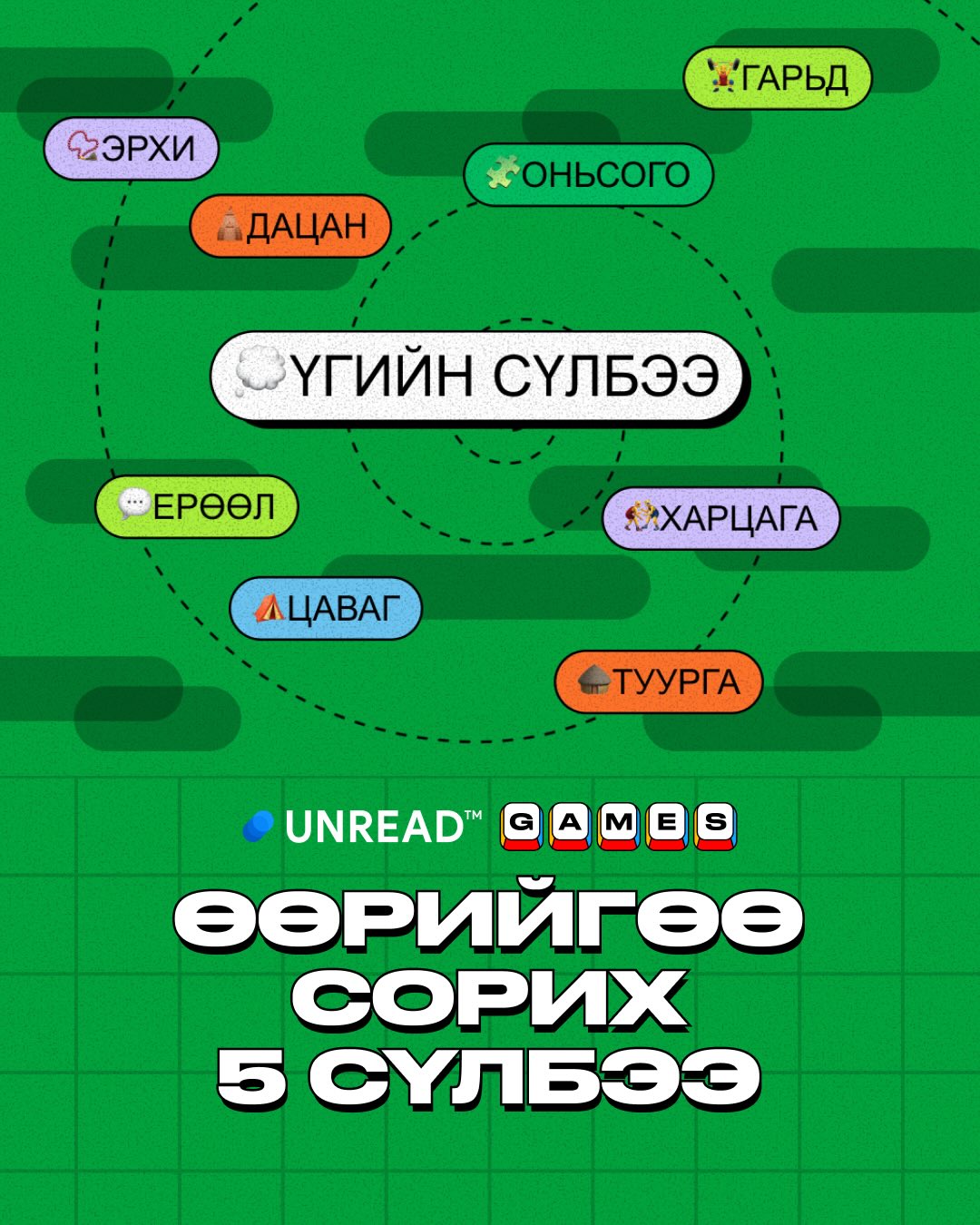 Уншигч та сүүлийн хэдэн өдөр Инстаграм стори, Viber групп чатаасаа “Үглэ, Сүлбээ” гэх үгтэй холбоотой, өнгө өнгийн эможитой тоглоомуудыг олж харсан байж магад. Хэрэв тийм бол тэдгээр нь манай редакцын хөгжүүлж буй unread.games-ийн эхний тоглоомууд юм.