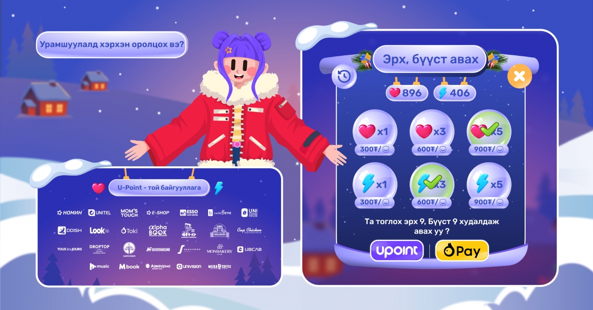 Номин сүлжээ дэлгүүр, Юнител, Tous Les Jours гэхчлэн U-Point оноо цуглуулах боломжтой байгууллагуудаар үйлчлүүлэн “Бэлэг дүүрэн” тоглоом тоглох эрхээ аваарай. Тоглоомоо тоглон цуглуулсан одоороо 50-100 хувийн хөнгөлөлттэй купон авах, супер бэлгийн эзэн болох боломжтой. Мөн U-Point оноо, Toki Pay ашиглан урамшууллын хуудас дотроос тоглоомын эрх нэмж худалдан авах боломжтой аж.