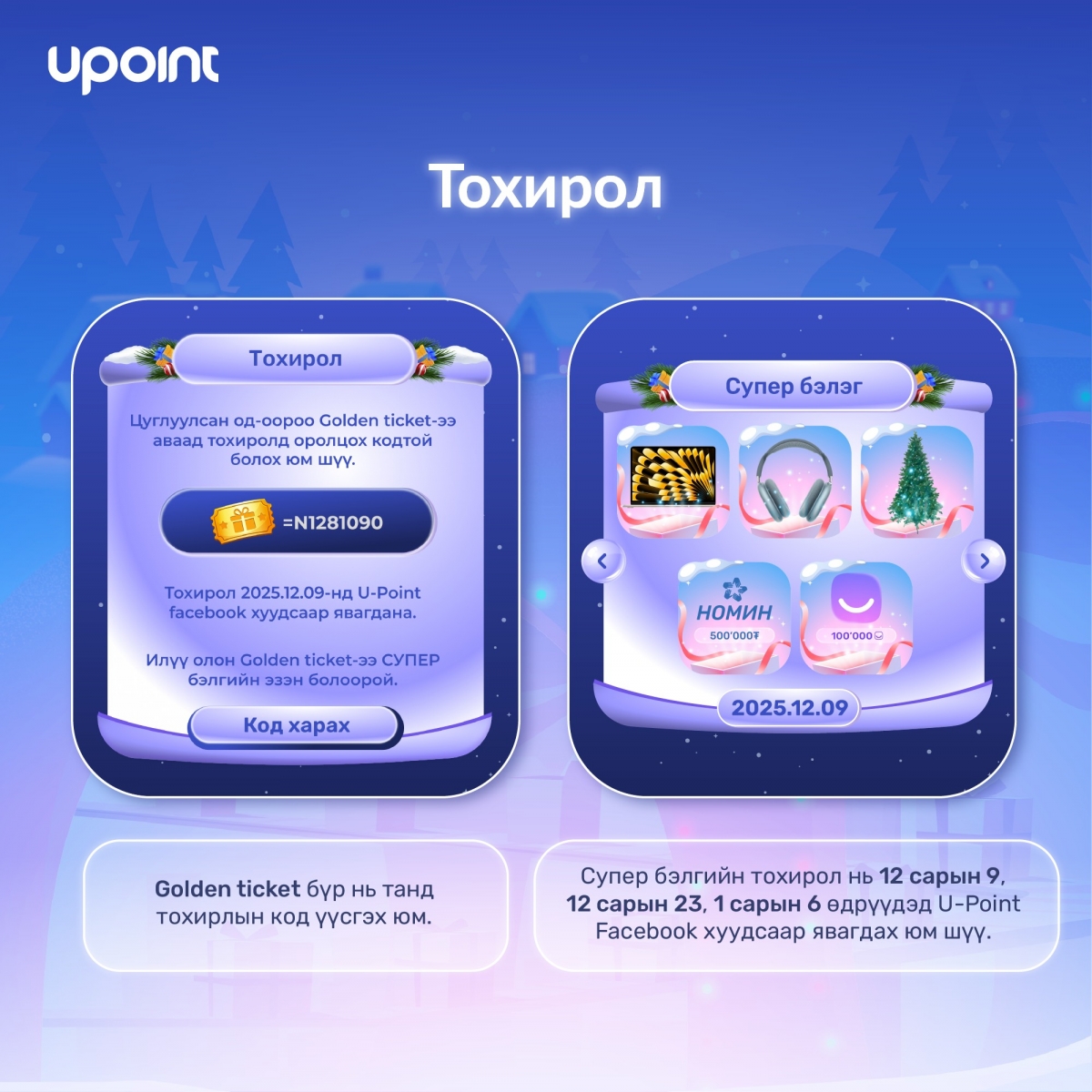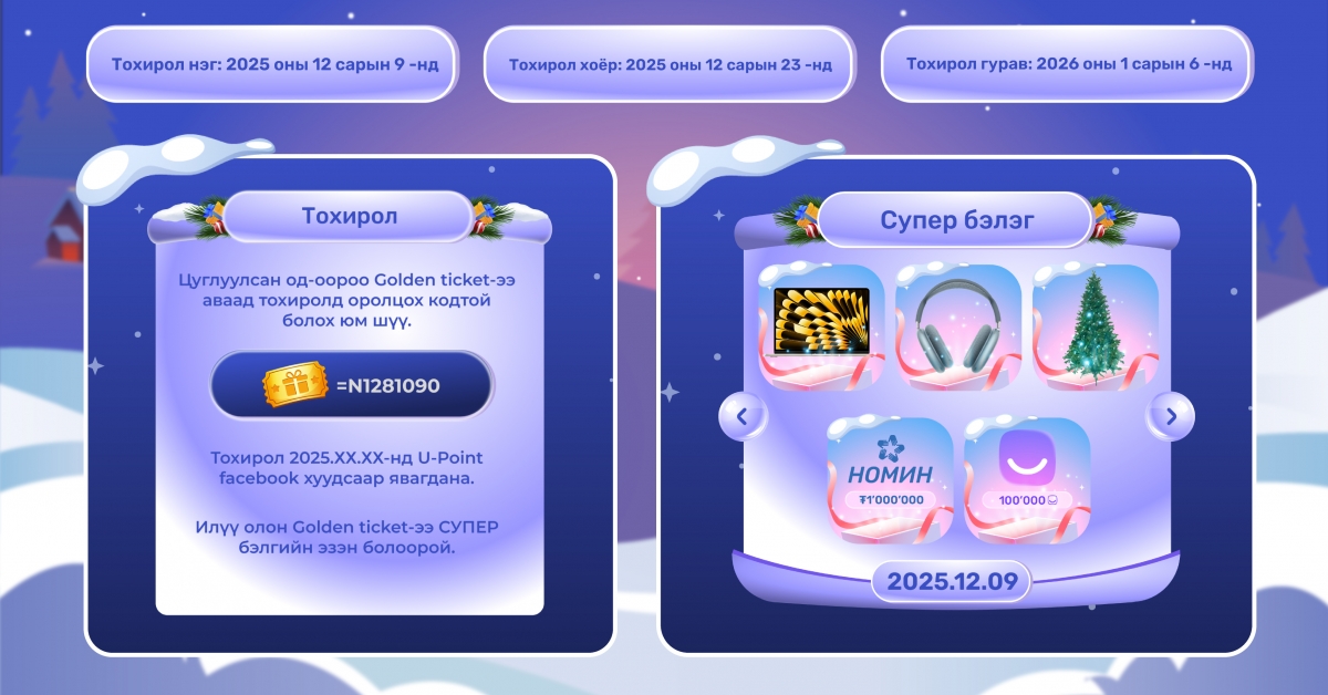 Супер бэлгийн санд Macbook, Airpod max, Гацуур мод, Iphone 17, Dyson агаар цэвэршүүлэгч, Номин сүлжээ дэлгүүрийн 1,000,000₮ эрхийн бичиг, Shoppy 500,000₮ эрхийн бичиг, 100,000 U-Point оноо зэрэг багтаж буй.