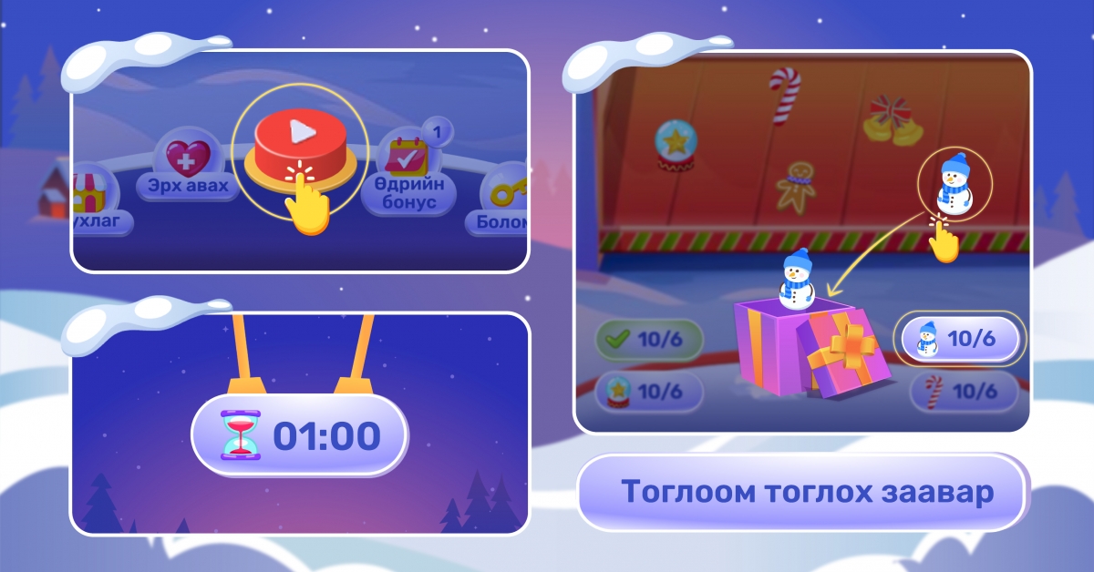 Та утсан дээрээ U-Point аппыг нээхэд гарч ирэх “Тоглох” товчийг дарж тоглоомоо эхлүүлнэ. Ийнхүү нэг минутын хугацаанд хамгийн олон бэлгийн хайрцгийг дүүргэх даалгаврыг биелүүлэх байдлаар тоглоом үргэлжилнэ. Хайрцаг тус бүрд түлхүүр, чихэр, жигнэмэг гэхчлэн дүрсийг заагдсан тоогоор сонгон хийх хийснээр танд урамшууллын купон авах од цугларна. Харин хайрцагт буруу дүрсийг сонгон оруулах бүрд таны цагаас нэг секунд хасагдана гэдгийг санаарай.