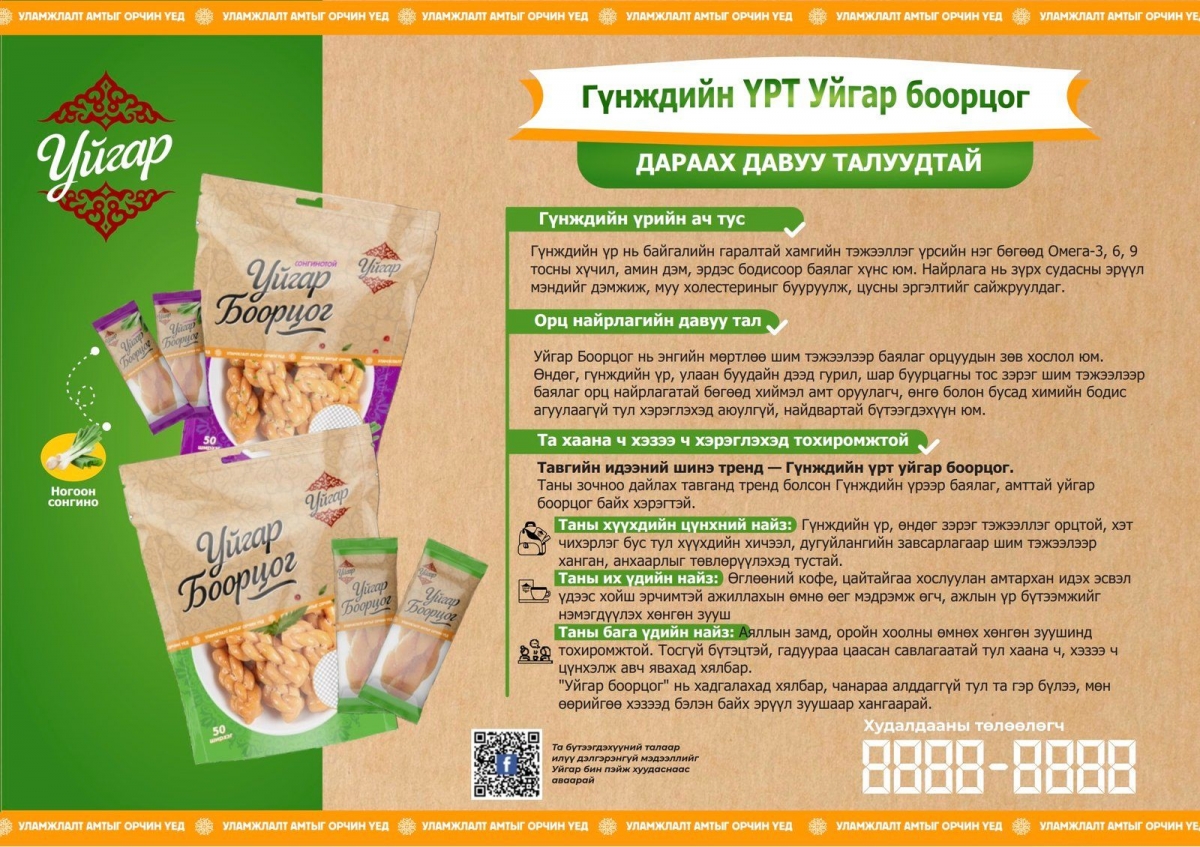 Уламжлалт амтыг орчин үеийн хэрэглээнд төгс нийцүүлсэн “Уйгар боорцог”-ийг та бүхэнд зах бөөний төвүүд болон 8 нэрийн дэлгүүрүүд, сүлжээ дэлгүүрүүдээс худалдан авах боломжтой.