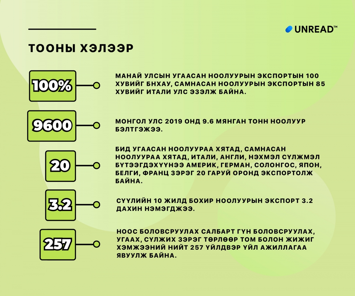 100%: Манай улсын угаасан ноолуурын экспортын 100 хувийг БНХАУ, самнасан ноолуурын экспортын 85 хувийг Итали улс эзэлж байна.