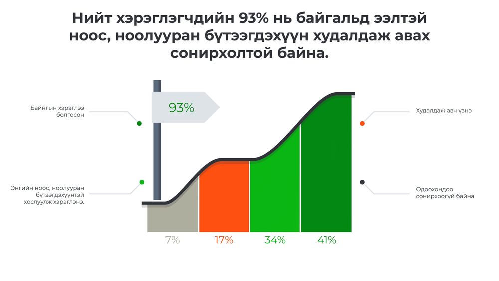 - 93 хувь нь тогтвортой аргаар хийсэн бүтээгдэхүүн худалдан авах сонирхолтой болохоо илэрхийлсэн байна.