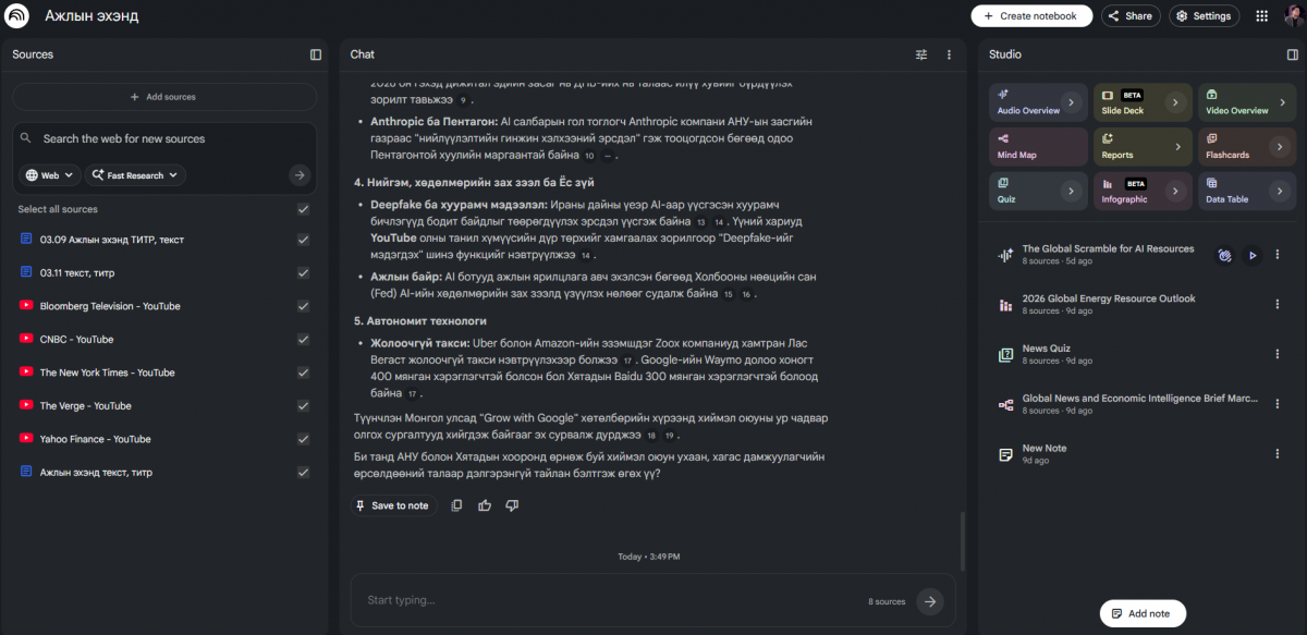 Энэ бол ирээдүйн суралцах хэв маягийг тодорхойлохуйц платформ. Notebook LM таныг нэг сэдвийн дагуу гүнзгий мэдлэгтэй болоход туслах юм. Судалгаа хийх, тэмдэглэл хөтлөхөд тун үр дүнтэй бөгөөд найдвартай эх сурвалжуудаа нэгтгэж, нэг дороос мэдээлэл авах боломжтой.