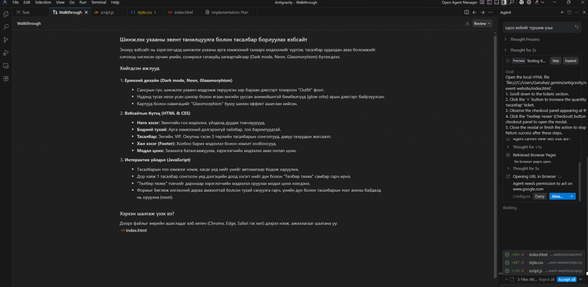 AntiGravity-ийг та өөрийн компьютер дээр татаж суулгаад ашиглах боломжтой. Вэбсайт хөгжүүлэх, мини тоглоом бүтээх, бүтээгдэхүүнээ туршихад энэхүү платформ төгс тохирно. Хүсвэл Stitch дээр дизайнаа гаргаад Antigravity дээр код бичүүлж хослуулан ашиглаж болно. Код бичүүлэх промптын хэсэг нь баруун доод буланд бий.