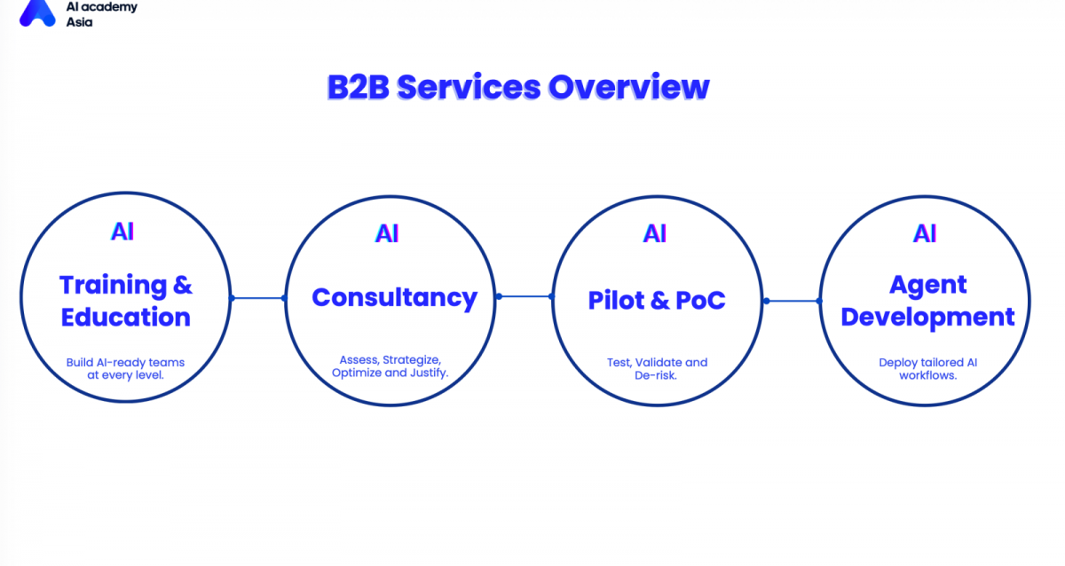 Ийм цогц шилжилтийг байгууллага дангаараа хийх амаргүй учраас зөвлөх байгууллагын оролцоо чухал. AI Academy Asia нь олон улсын хиймэл оюуны экпертүүдтэй хамтран байгууллагын онцлог, бэлэн байдалд тулгуурлан сургалт, зөвлөх үйлчилгээ, pilot төсөл, захиалгат хиймэл оюуны шийдлийг санал болгодог билээ. Тэд Голомт Банк, ХААН Банк, Энержи Ресурс ХХК, НҮБ-ийн Хүүхдийн сан зэрэг байгууллагуудтай хамтран ажилласан бодит туршлагатай бөгөөд доорх 4 чиглэлийн үйлчилгээг санал болгодог: