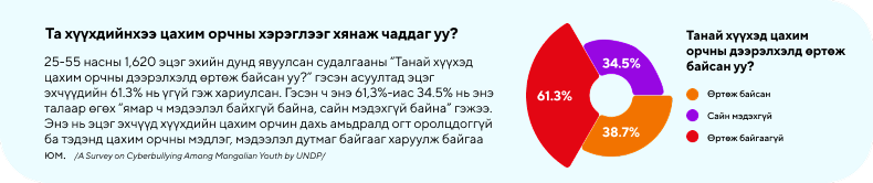 - 9-12 насны хүүхдүүдийн дунд гурван хүүхэд тутмын нэг нь цахим дээрэлхэлд өртөж байсан бол 13-17 насанд энэ үзүүлэлт 51.3%-д хүрдэг.