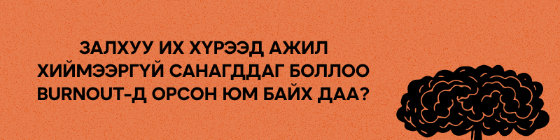 КОВИД-19 цар тахлын үеэр бид гэрийнхээ зөөлөн буйдан дээр тухлан, дэлгэцийн ард сууж хичээл, ажилдаа хамрагдсаар дөрвөн жилийг ардаа үлдээжээ. Цар тахлын дараах хөл хорио цуцлагдаж, амьдралын хэв маягаа буцаан олж авахыг хичээх энэ үед “Burn-out Syndrome” буюу ажлаас халшрах хам шинж хэмээх ойлголт дэлгэрч, зарим маань өөрсдийгөө энэ шинж тэмдэгтэй хэмээн оношлоод амжсан байх.