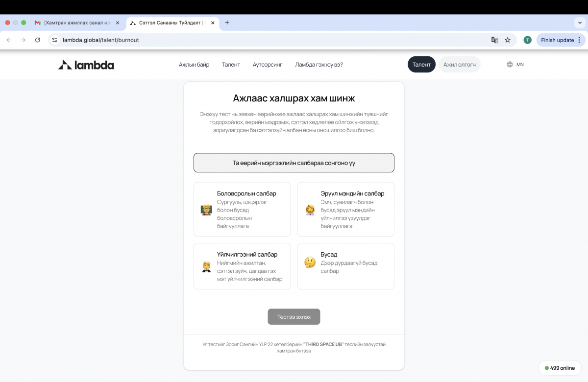 Нийт 600 хүнээс анхдагч байдлаар burnout-ийн талаар ерөнхий мэдээллийн судалгаа авч, 10 оролцогчдыг сонгон Мета сэтгэлзүйн төвтэй хамтран ганцаарчилсан сэтгэлзүйн зөвлөгөөг үнэ төлбөргүй өгсөн юм. Уг ажлын цар хүрээг улам тэлж илүү олон хүнд сэтгэлзүйн байдлаа мэдэхэд нь туслах зорилгоор залуу мэргэжилтнүүдтэй хамгийн ойр ажилладаг Lambda Global-тай хамтран тэдний …. бүхий вэбсайт дээр burnout-ийн тусгай цэс боловсруулжээ.