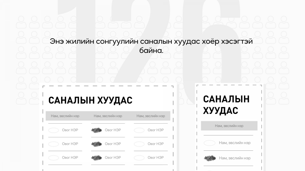 1. Нэр дэвшигчдэд санал өгөх хуудас: Амьдарч буй тойрогт тань өгөгдсөн мандатын тоогоор нэр дэвшигчдэд саналаа өгнө. Жишээ нь, танай тойрог гурван мандаттай бол та гурван хүнд санал өгөх ёстой. Ингэхдээ хүссэн гурван нэр дэвшигчээ сонгож болох ба тэр нь заавал нэг намын хүмүүс байх шаардлагагүй.