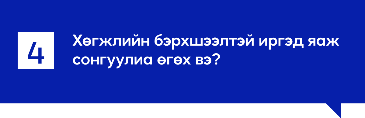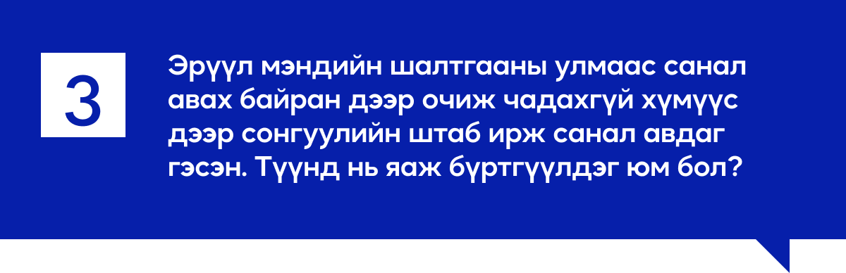 “Сонгуулийн тухай хууль”-иар санал авах байр бүрд харааны бэрхшээлтэй сонгогчдод саналаа өгөхөд зориулсан брайль үсэг бүхий хавтас болон тэргэнцэртэй сонгогч, хөгжлийн бэрхшээлтэй иргэнд зориулсан нэгээс доошгүй санал бэлтгэх бүхээгийг тусгайлан тоноглож бэлтгэсэн байх ёстойг тодорхой заасан байдаг. Энэ шаардлагыг нэг талаас санал авах байр бүр хангах үүрэгтэй, нөгөө талаас бид ч биелүүлэхийг шаардах эрхтэй юм шүү.
