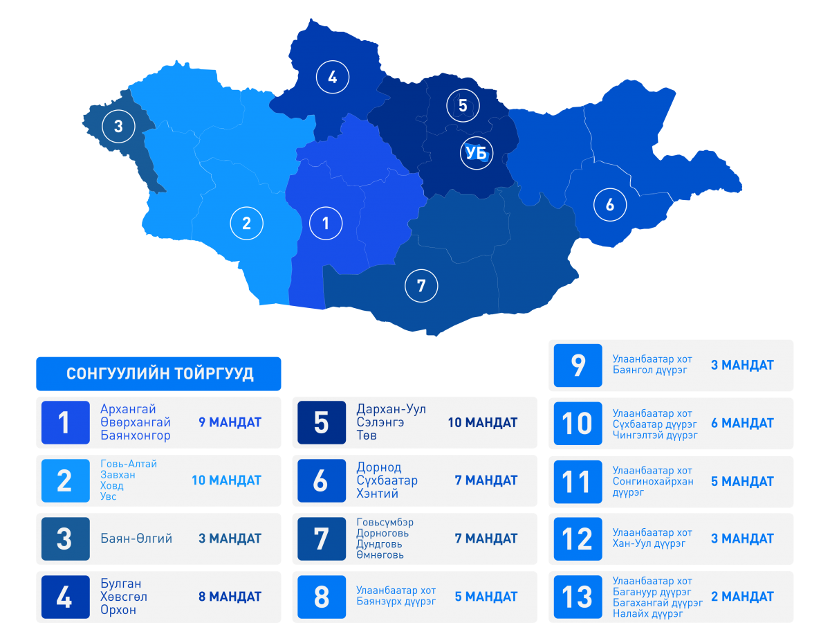 Доорх зурагт тойргийн хуваарилалт болон, тойрог бүр дээр хэдэн хүнийг сонгож болох тооны хамтаар харууллаа.