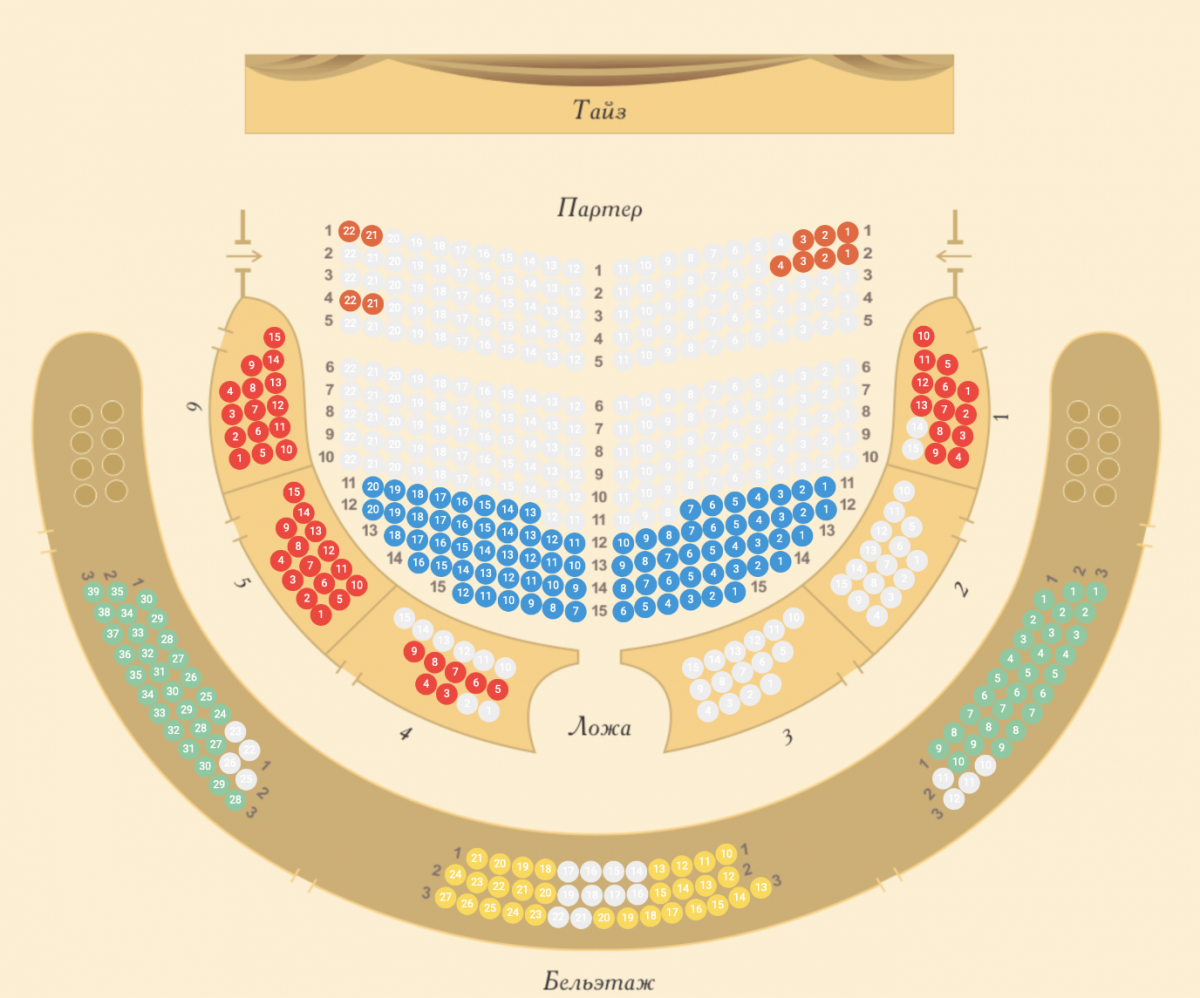 Товчхон танилцуулахад, “Партер” хэсэг бол тайзтай хамгийн ойрхон, хамгийн сайн хараацтай, дуугаралттай, тиймдээ ч хамгийн үнэтэй суудал юм. “Ложа” нь түүний араас дагах үнэтэй суудал бол “Бельэтаж” нь хамгийн тааруу үзэгдэцтэй, хямд суудал. Бельэтажийн захын суудлуудад тайз бараг л харагдахгүй буюу 20 хувийн л хараацтай.