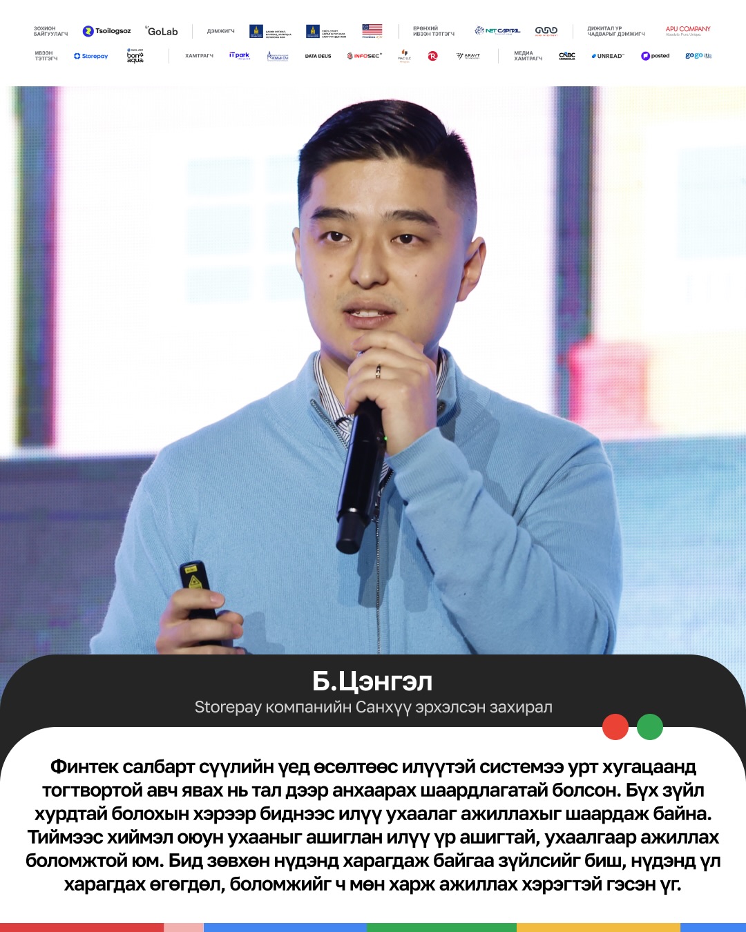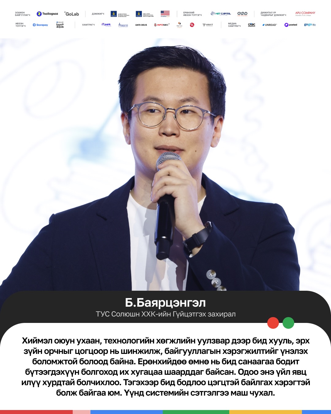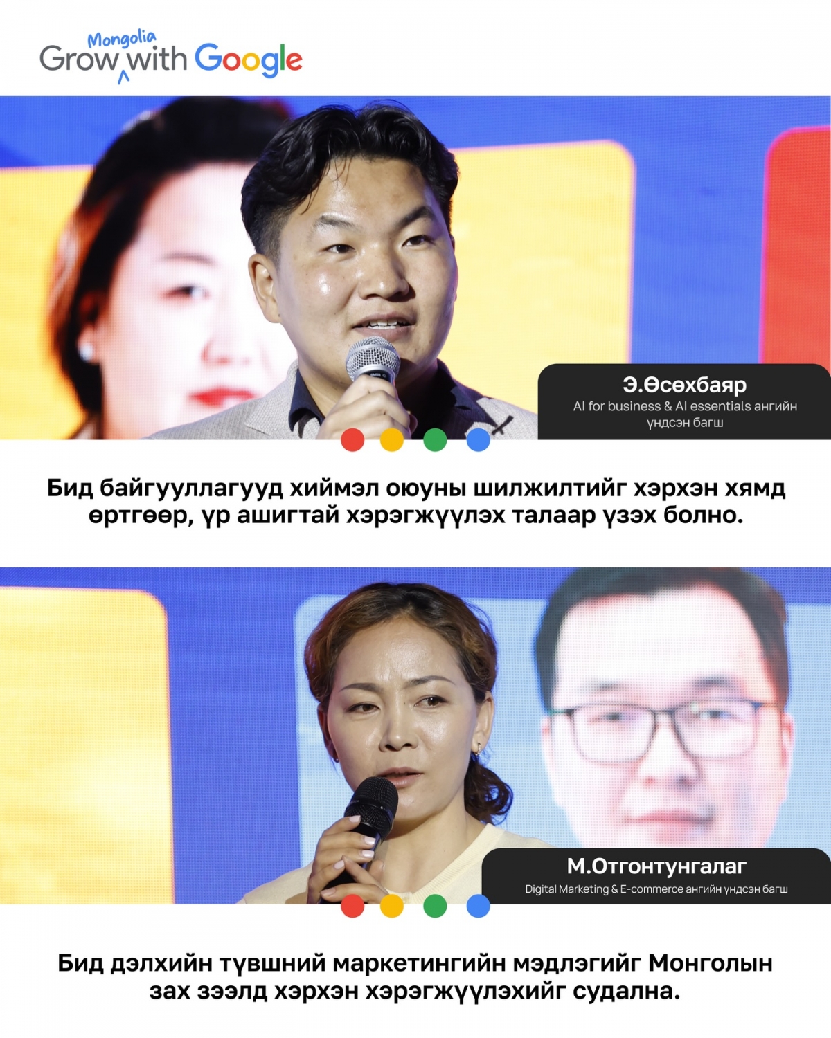 Арга хэмжээг нээж Google Cloud-ийн Ази, Номхон далайн Бүс нутгийн стартап хөгжил хариуцсан менежер Esna Ong албан ёсны видео мэндчилгээ хүргэсэн ба түүний дараа Google-ийн Монгол дахь суурин төлөөлөгч Э.Өсөхбаяр “Дэлхийн ур чадварыг дэргэдээсээ” сэдэвт илтгэлээ танилцуулсан юм. Тэдний хувьд Google-ийн үйл ажиллагааг 2023 онд албан ёсоор Монголд эхлүүлж, хамтын ажиллагааны хүрээнд Google for Education, Google for Startups, Google Arts & Culture, Google Maps, Google Pay, Android апп доторх худалдан авалт зэрэг чиглэлд тогтвортой үйл ажиллагаа явуулж буй. Энэ талаар онцлох тоо баримт, үр дүнг илтгэлдээ хуваалцсаны сацуу эл бүх үйлчилгээг Монголдоо нутагшуулахад төр, хувийн хэвшлийн хамтын ажиллагаа гол тулгуур болж буйг онцолсон юм.